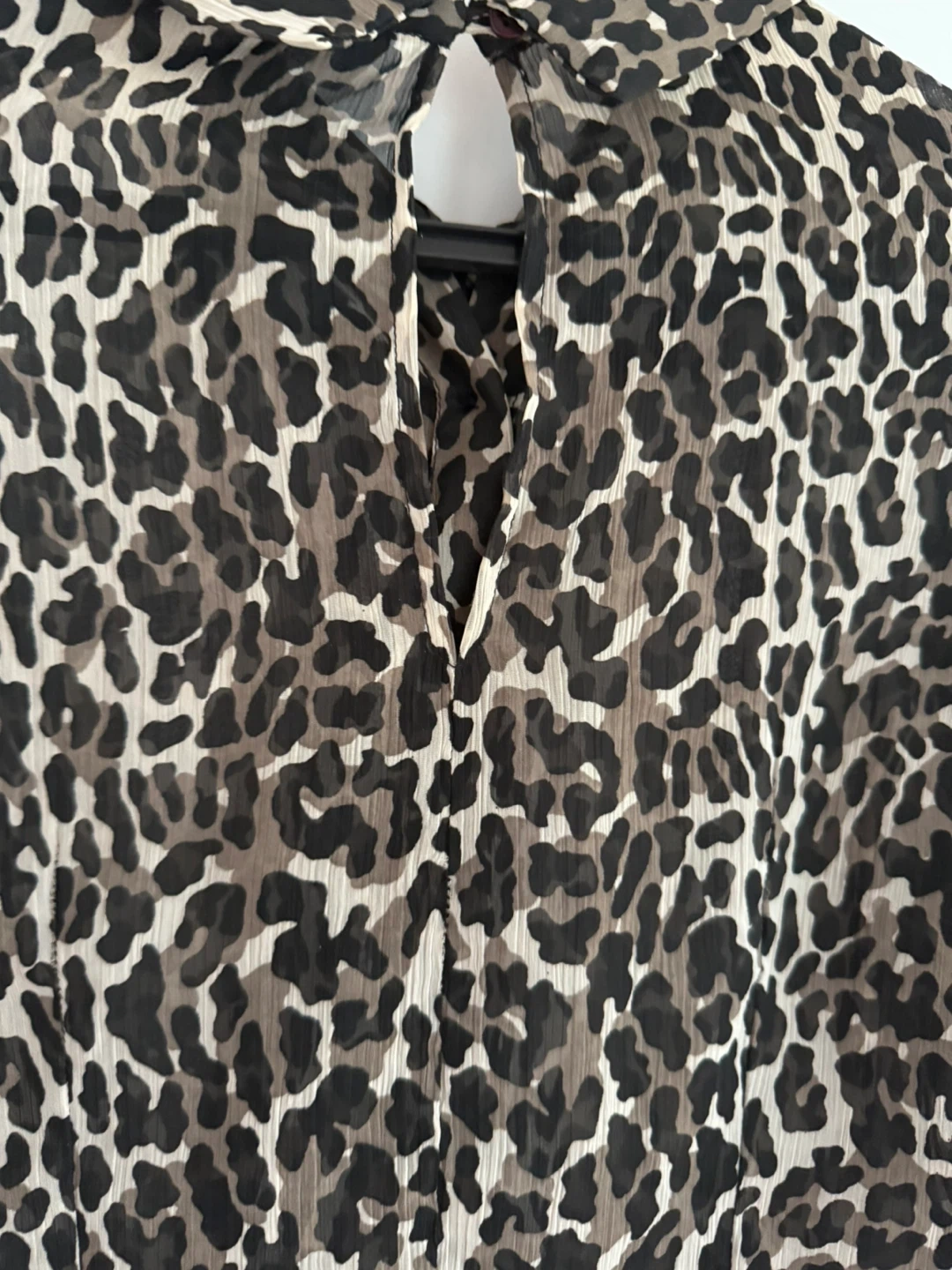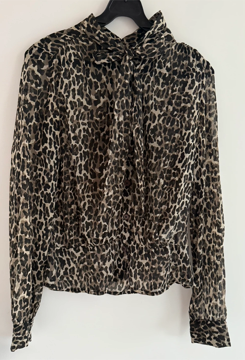 This is a French Connection blouse in size 6. It features an animal print and a tie neck detail. Great for adding a stylish touch to your wardrobe!