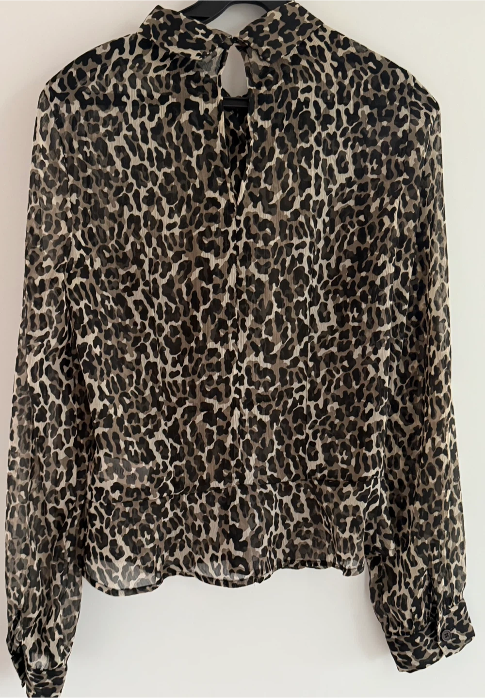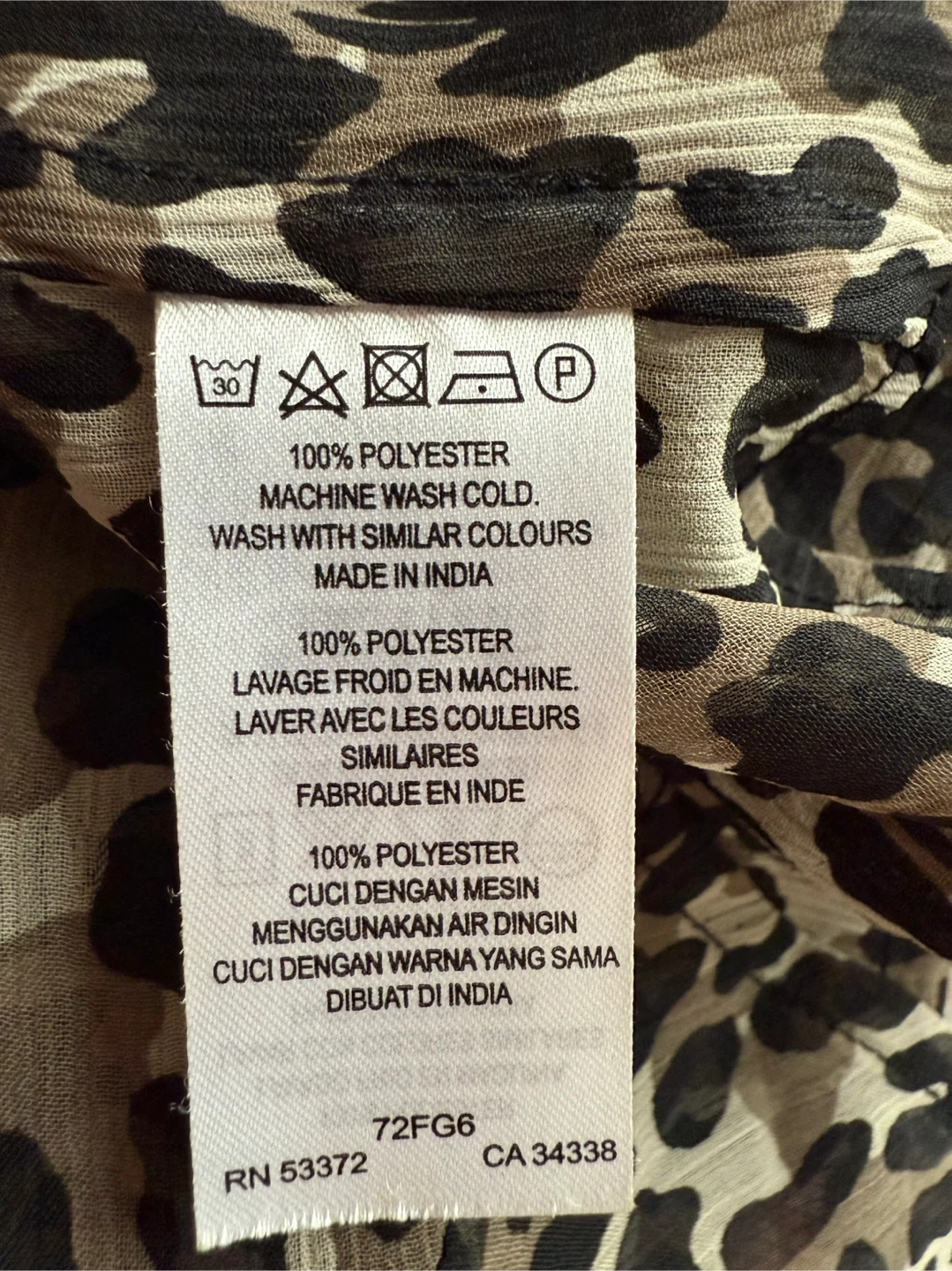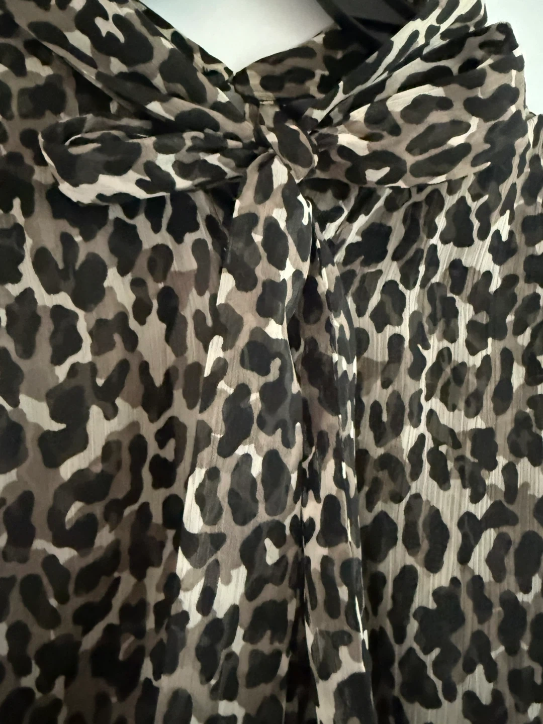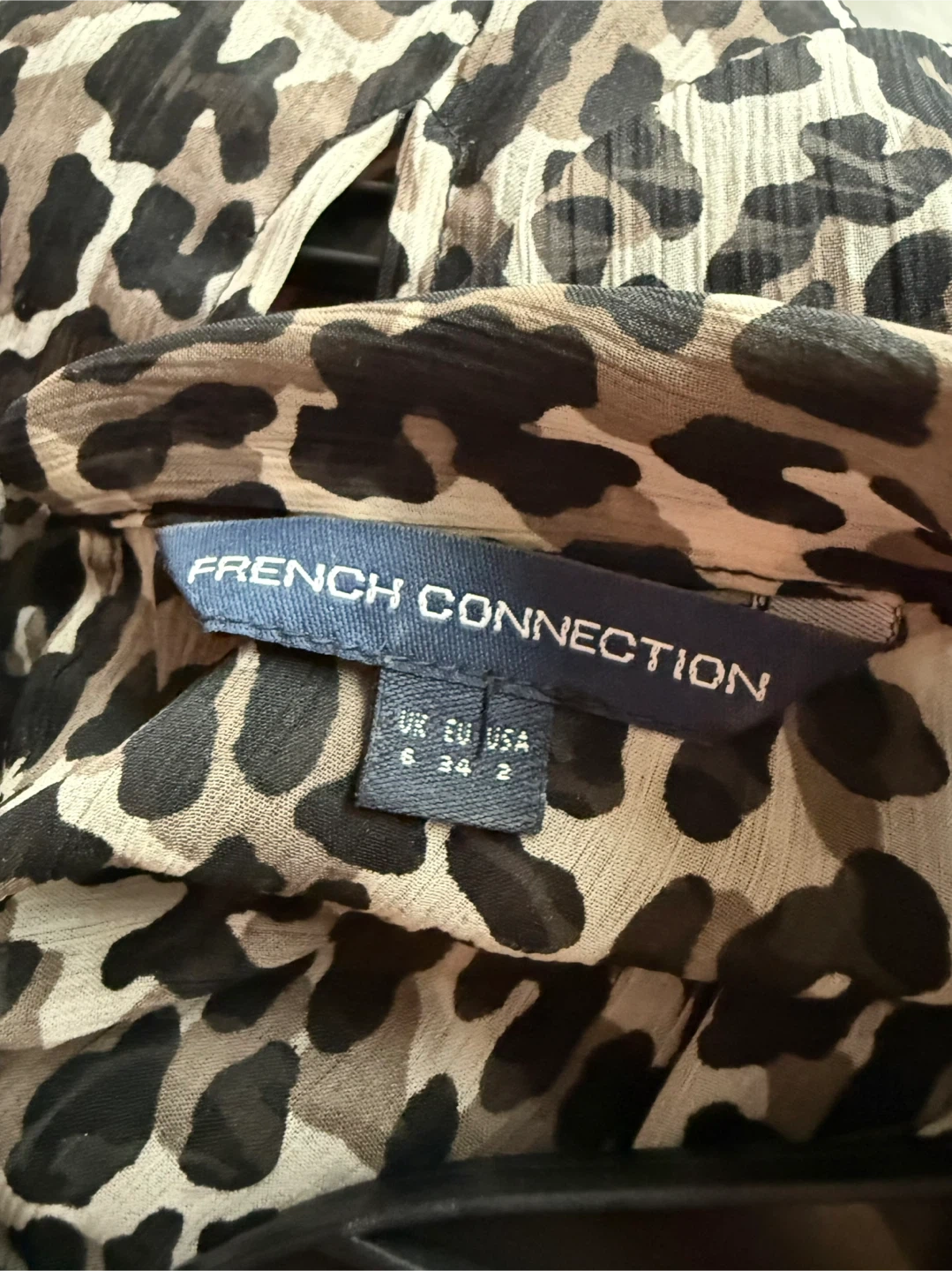 This is a French Connection blouse in size 6. It features an animal print and a tie neck detail. Great for adding a stylish touch to your wardrobe!