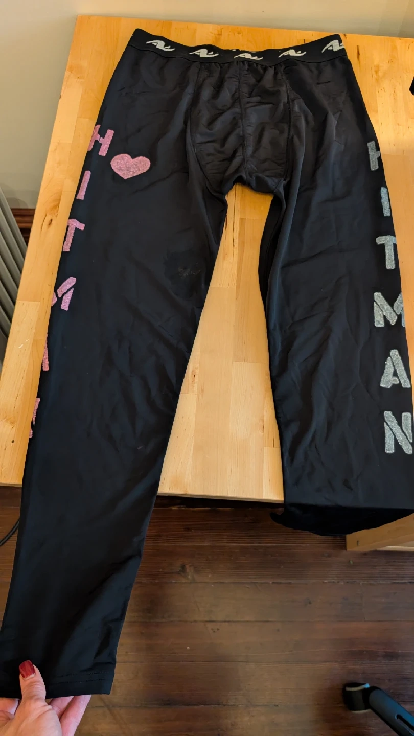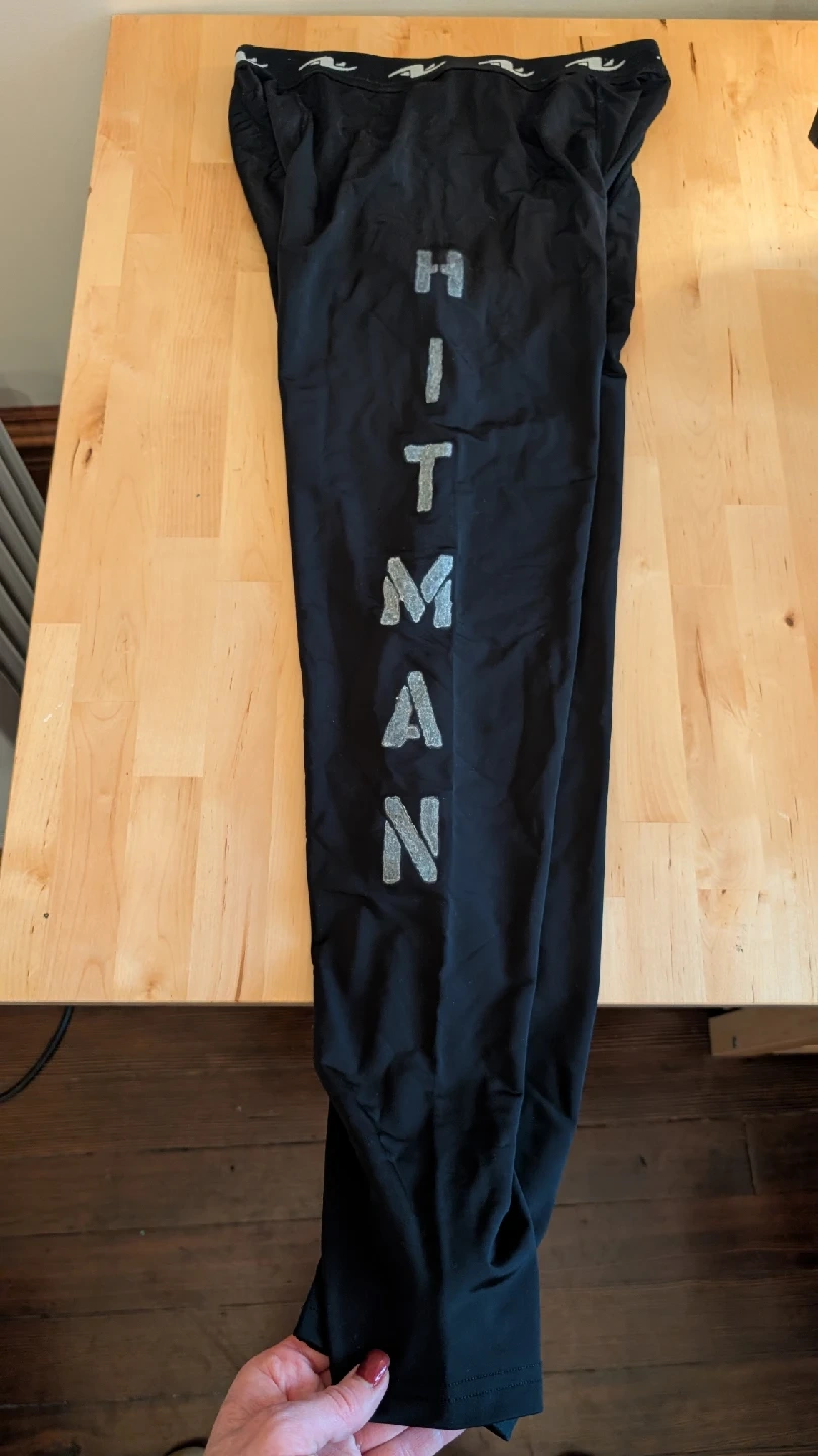 Men's Athletic Works stretchy pants (size Medium) with the word "Hitman" stencilled in white and pink fabric paint. Was worn with a white tank top, sun glasses, and a leather jacket (not included).