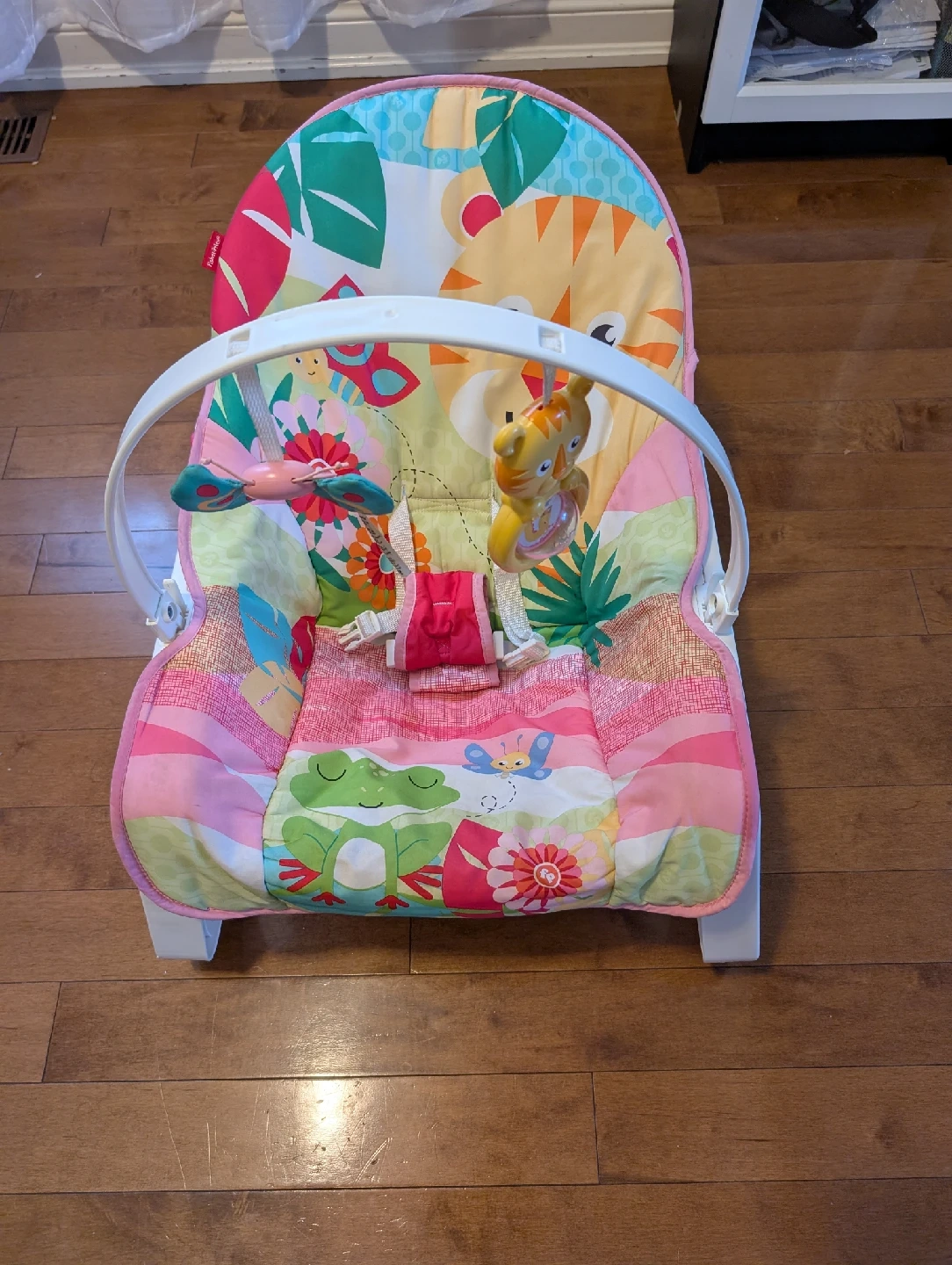 Here's a gently used Fisher-Price baby bouncer! It's in great shape and features a fun, colourful design with animal and nature themes. Perfect for keeping your little one entertained and comfortable.