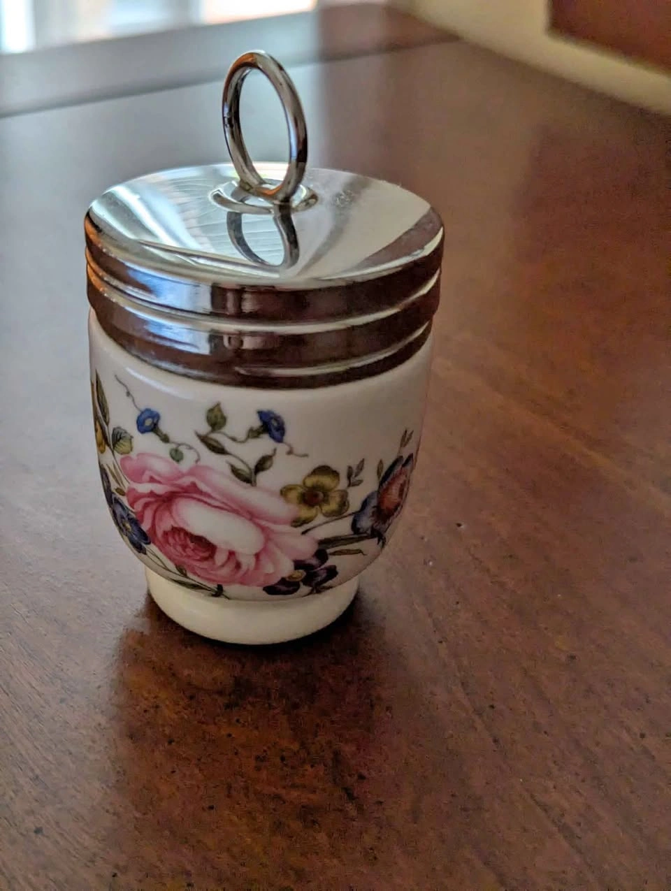 21Porcelain floral egg cobbler in good condition. It measures 4 inches tall with the lid. North end St Catharines pickup, cash only please