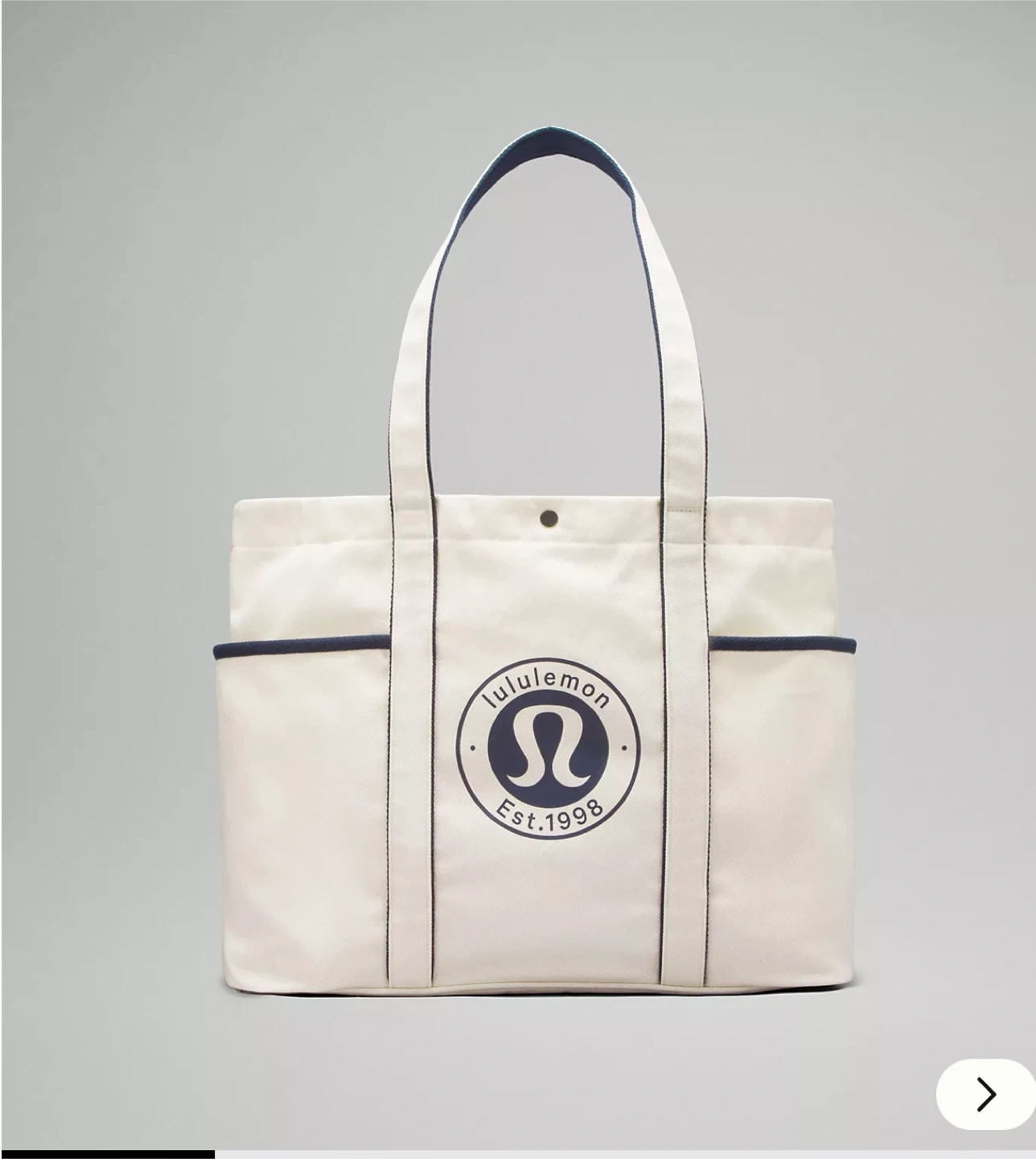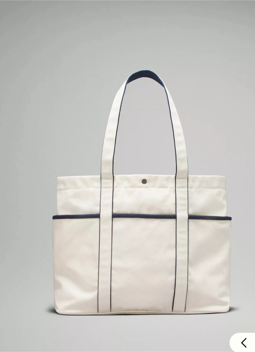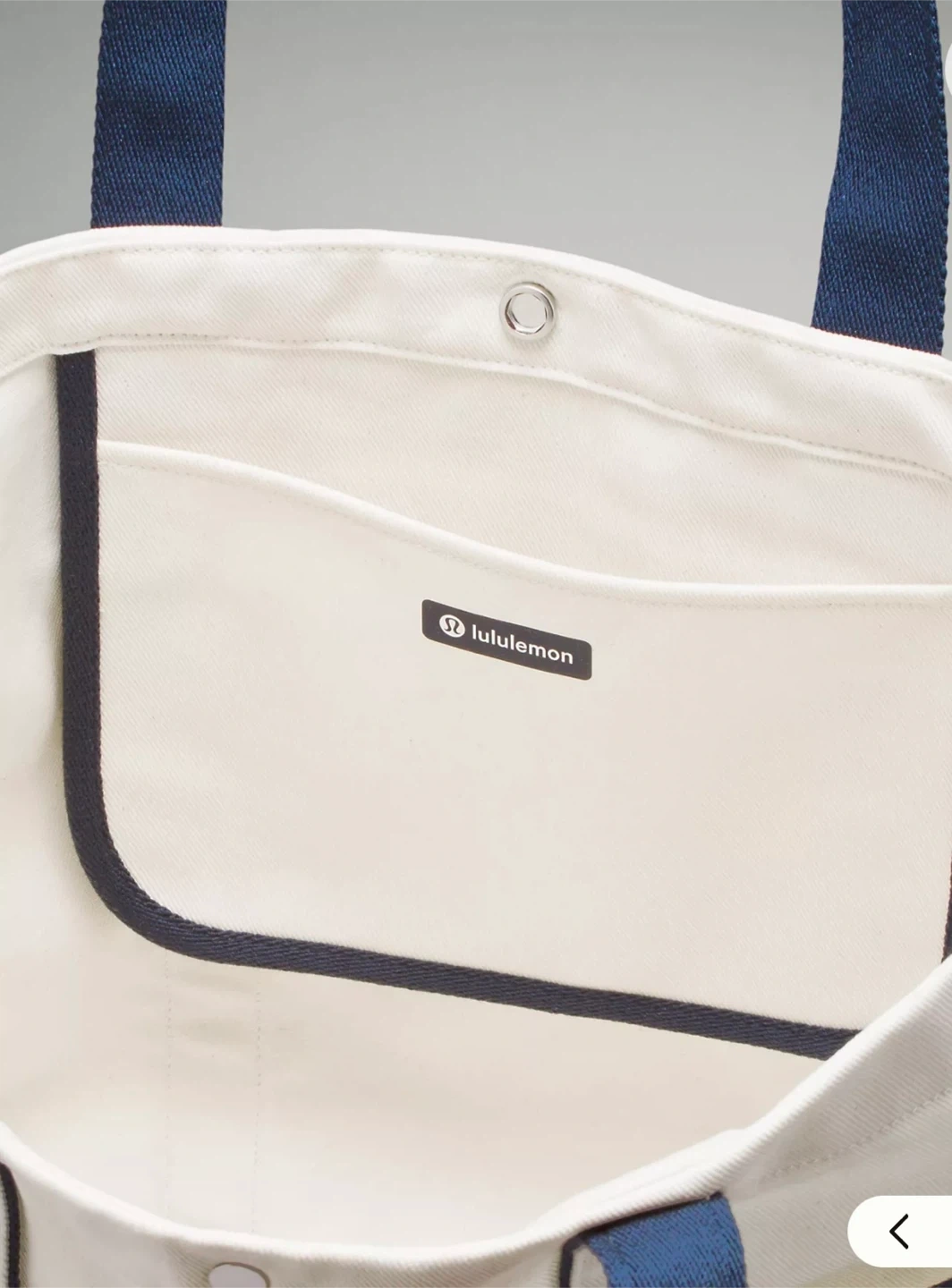 This Lululemon tote bag is in very good condition and ready for a new home! It’s barely used. It's a stylish and practical bag, perfect for everyday use. The bag is ivory with navy accents, giving it a classic look. It's made of durable material, so it can handle all your essentials