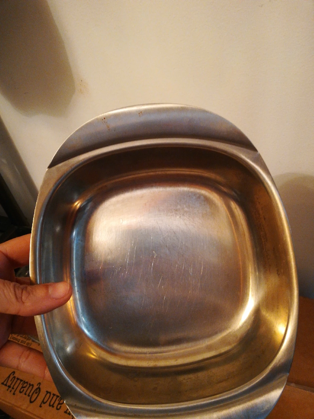 Selling a stainless steel serving dish. It has some scratches from use, but is still in good condition for serving food. It's a sturdy and practical piece for any kitchen!