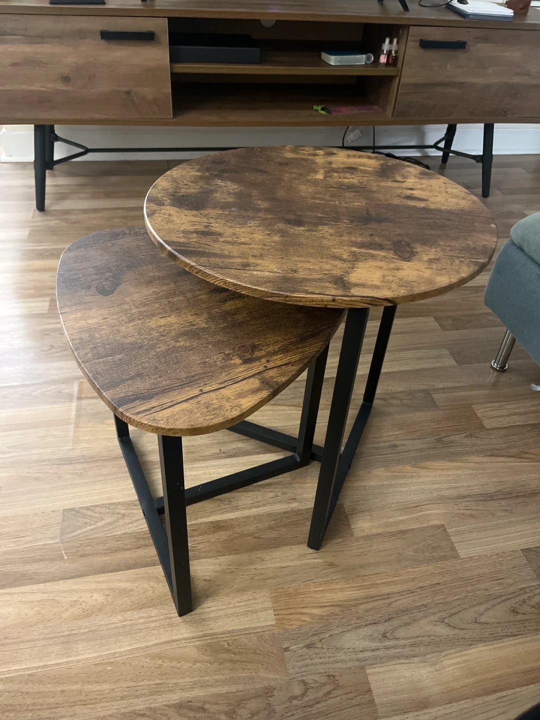 Set of two coffee tables in a rustic brown finish. These tables are perfect for adding a touch of warmth to any room. They're in great condition and ready for a new home!