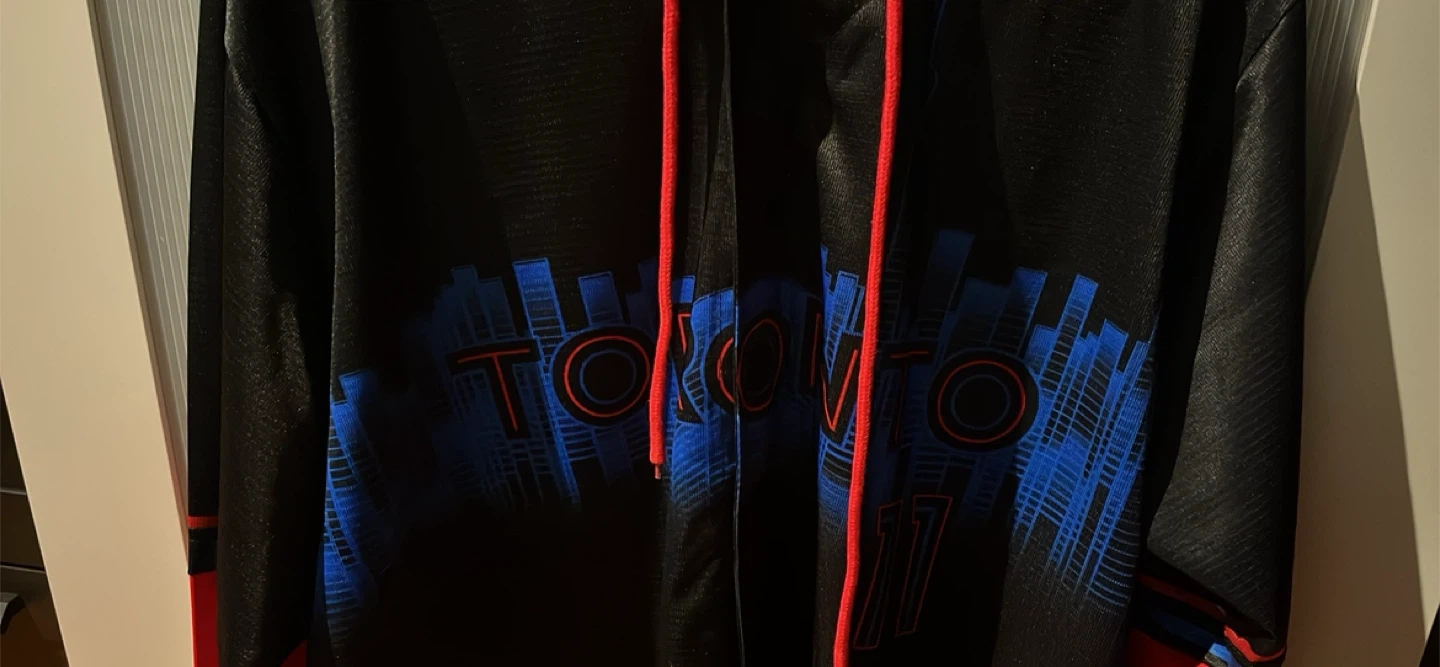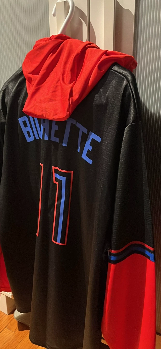 Selling a Toronto Blue Jays Bo Bichette #11 jersey hoodie. It's black with red sleeves and a red hood. The back has 'Bichette' and the number 11 in blue. The front has 'Toronto' in blue with red outlines. Great for any Blue Jays fan!