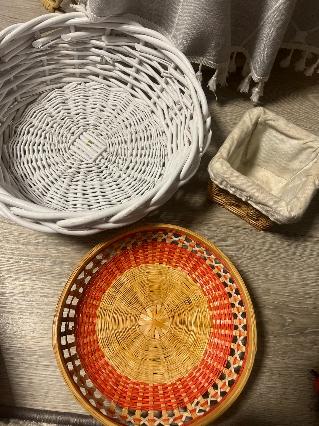Selling a set of three assorted wicker baskets! Includes a large white round basket, a small square basket with a cloth liner, and a colorful round basket with a woven design