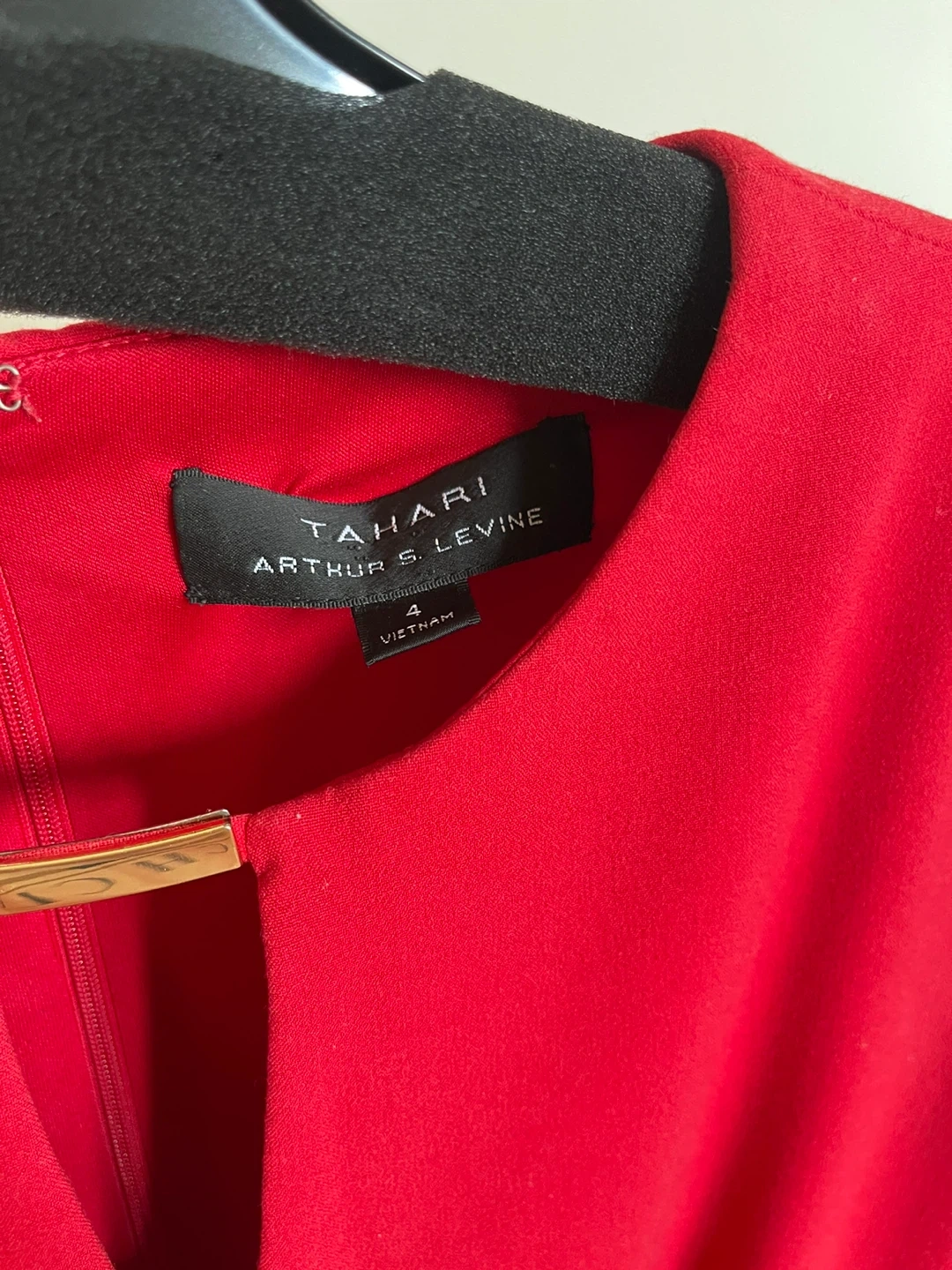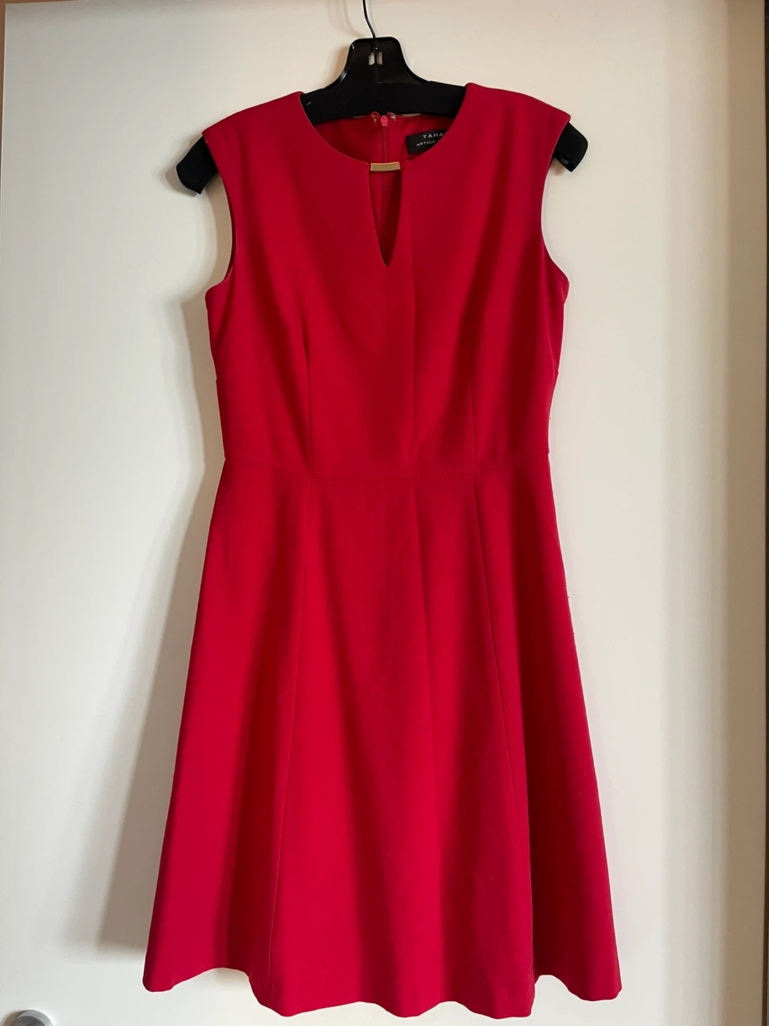 Tahari Arthur S. Levine red sleeveless dress. It's a beautiful dress, size 4. This dress features a keyhole neckline with a gold accent.