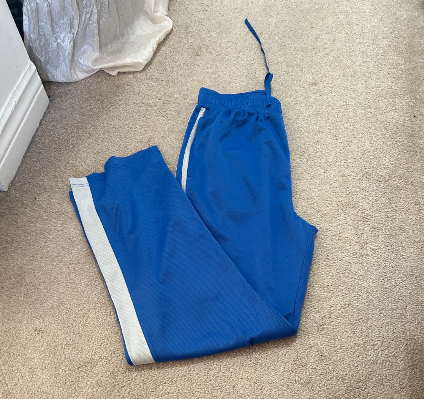 18Selling a pair of blue track pants with a white stripe down the side. They're in great condition and would be perfect for sports or just lounging around