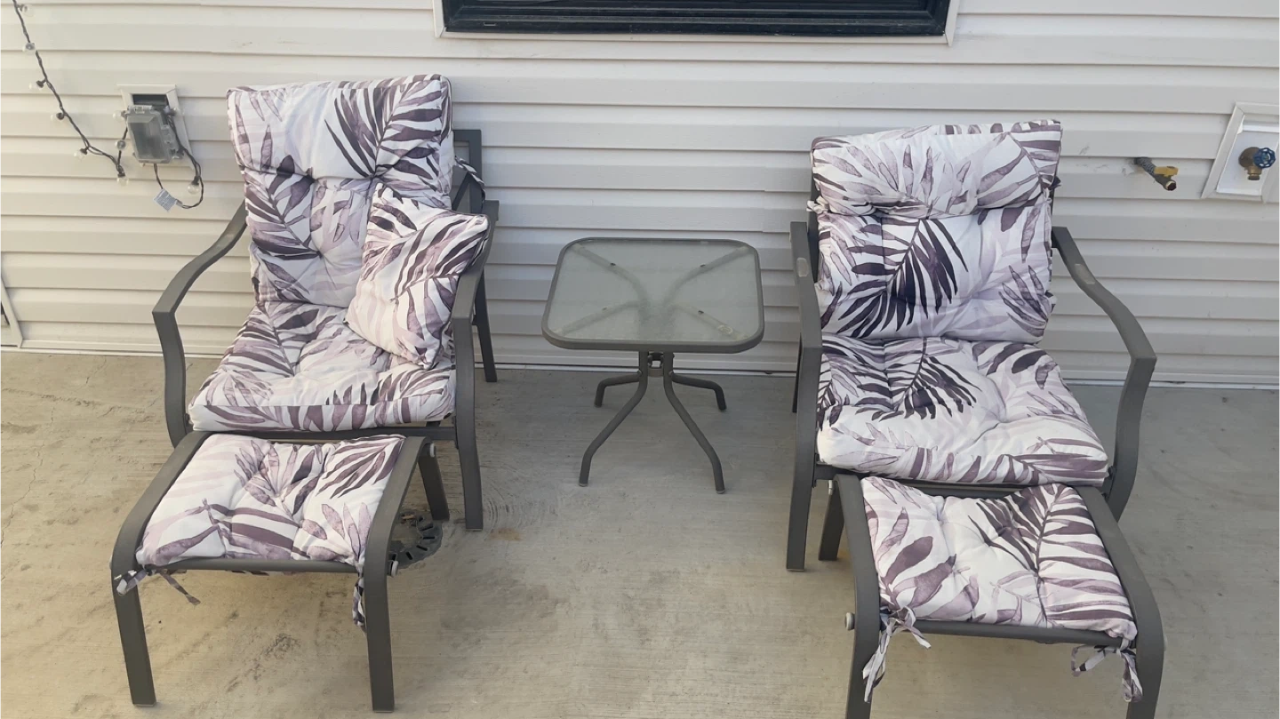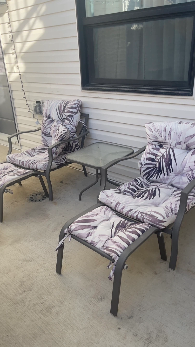 Selling a lovely outdoor patio set! Includes two chairs with foot rests , and a small glass-topped table. Steele chair frames and table base, very durable. The cushions have a stylish leaf pattern in shades of purple and white.