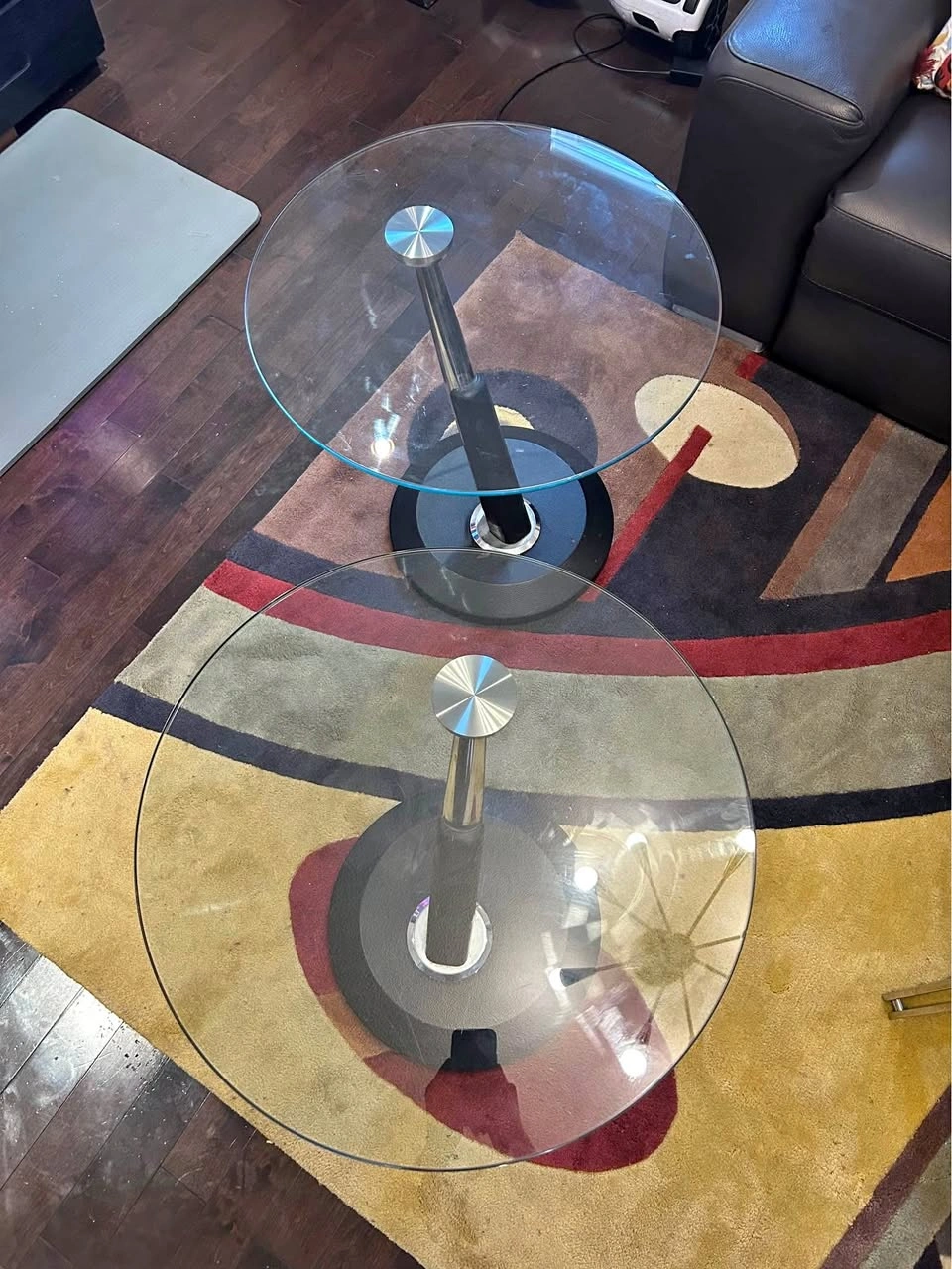 10Selling two glass tables, 60 each. Or 100 together. Both are in great condition — no cracks or chips. Modern style with a clear glass top and sturdy metal legs. Perfect as coffee tables, side tables, or for small setups. Located in Brampton.
