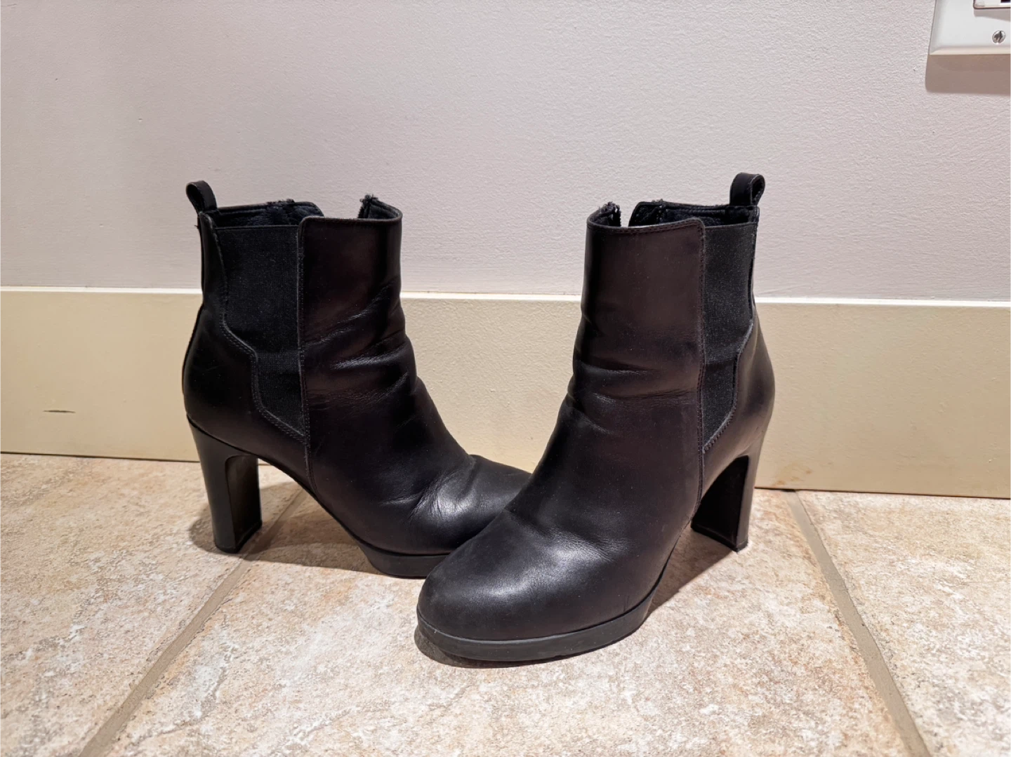 Selling a pair of Geox black leather ankle boots. They're in good condition and are a European size 36, which is a US/Canadian size 6. These boots feature a comfortable heel and a stylish design, perfect for everyday wear!