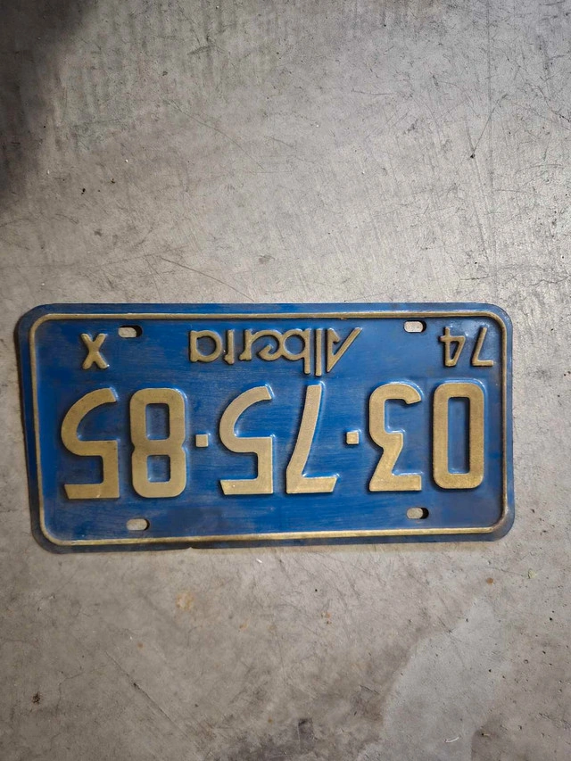Check out this vintage Alberta license plate from 1974, featuring the number 03-75-85 in gold lettering on a blue background. This plate shows its age with some wear and tear, adding to its authentic, retro charm. A cool piece of Alberta history! Looking to add some vintage flair to your garage, man cave, or collection? This license plate is just the ticket. If the ad is up, the plate is available. Feel free to make an offer; I'm always open to reasonable negotiations.