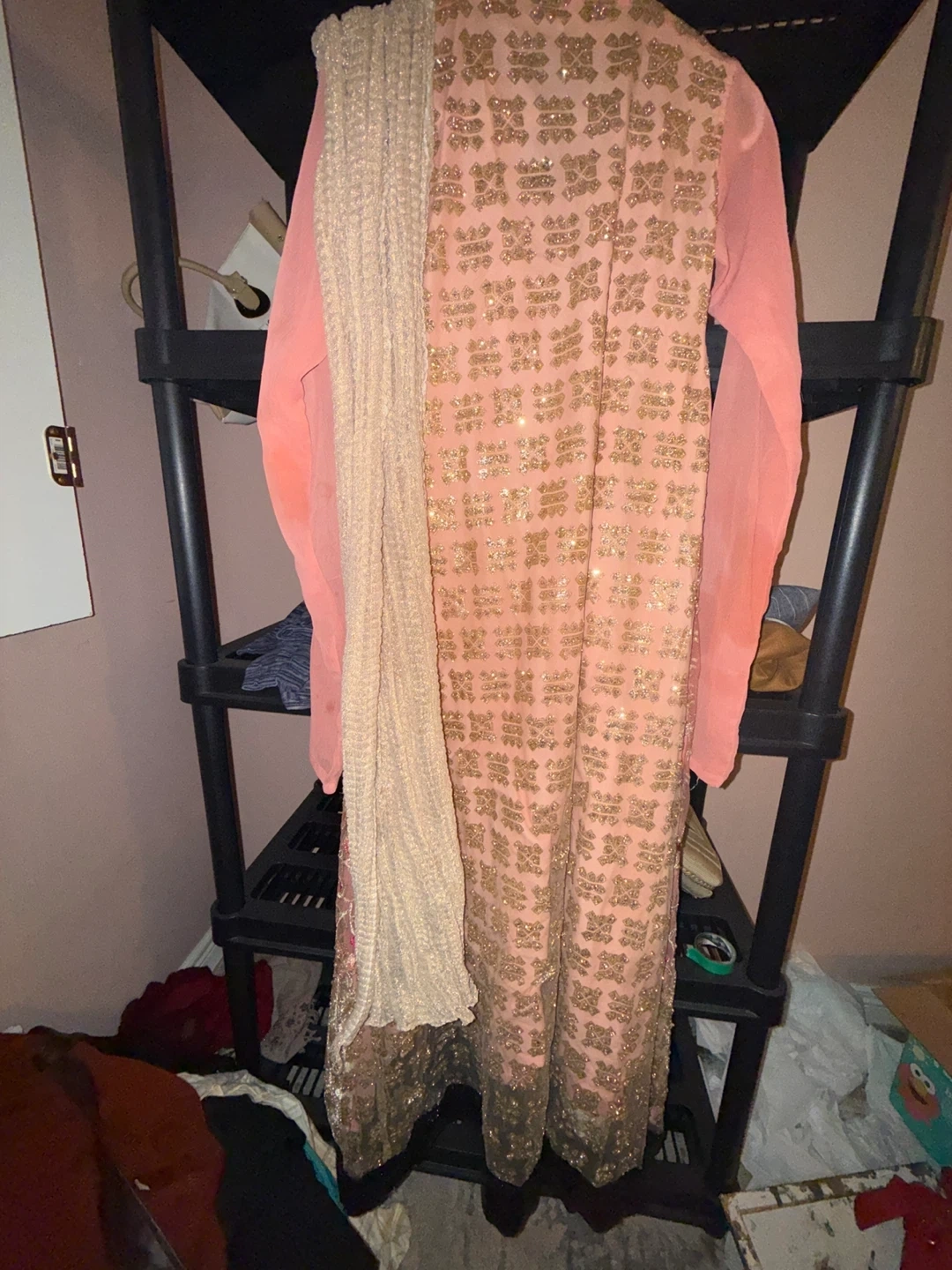 75Selling a beautiful peach-coloured dress with intricate embroidery. It comes with a matching scarf to complete the look. The dress features colourful floral detailing around the neckline and subtle embellishments throughout. It's in great condition and ready for a new home!