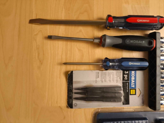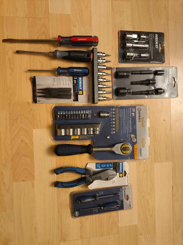 Premium KOBALT and NEIKO tool collection — perfect for home, garage, or workshop use. Includes high-quality sockets, screwdrivers, pliers, and bit sets — most brand new in packaging. Included Tools: KOBALT 20-piece socket & ratchet set KOBALT 3-piece cold chisel set KOBALT 2-piece plier set (new) KOBALT precision screwdrivers (new pack) NEIKO socket adapter & impact bit sets Various KOBALT screwdrivers & accessories Condition: Mostly brand new or barely used, all cleaned and organized. Price: $120 (or best offer) Location: North York, Ontario Curbside pickup available or local delivery Contact: Safesense Solutions Ltd. WhatsApp: 437-663-7574