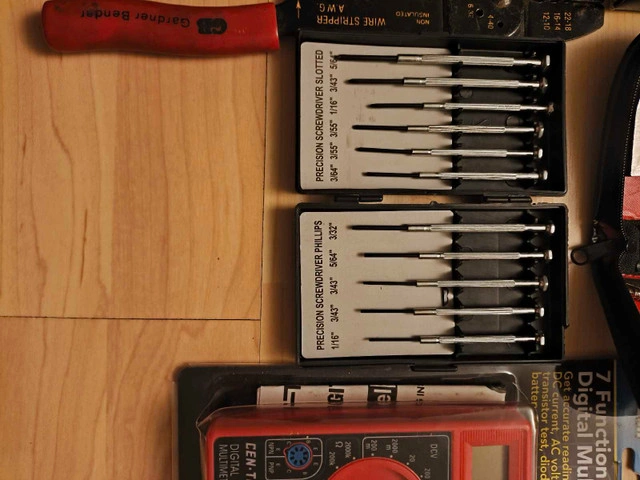 All-in-one electrical repair and precision tool set, perfect for electricians, technicians, DIY projects, or household use. Includes everything you need for testing, wiring, assembly, and small repairs — neatly organized and mostly unused. Included Items: Digital multimeter (7-function) – brand new AC voltage tester pen Electrical test light 2 wire strippers / crimping tools 2 precision screwdriver sets Mini tool kit with wrenches, pliers & screwdrivers Insulated screwdrivers Condition: Excellent overall – some brand new, others lightly used and cleaned.