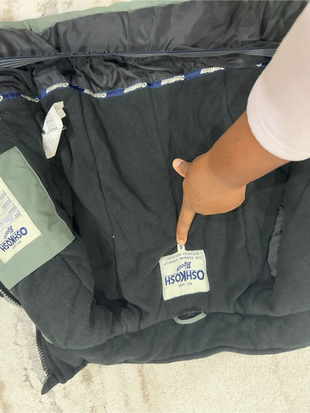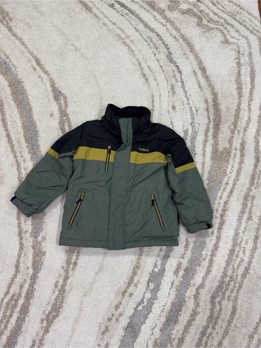 Selling a gently used OshKosh winter jacket in size 6, It's perfect for keeping your little one warm during the colder months. The jacket features a stylish design with black, green, and yellow accents. It is in great condition and ready for a new home