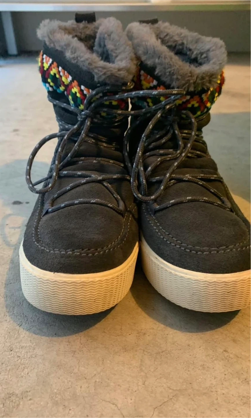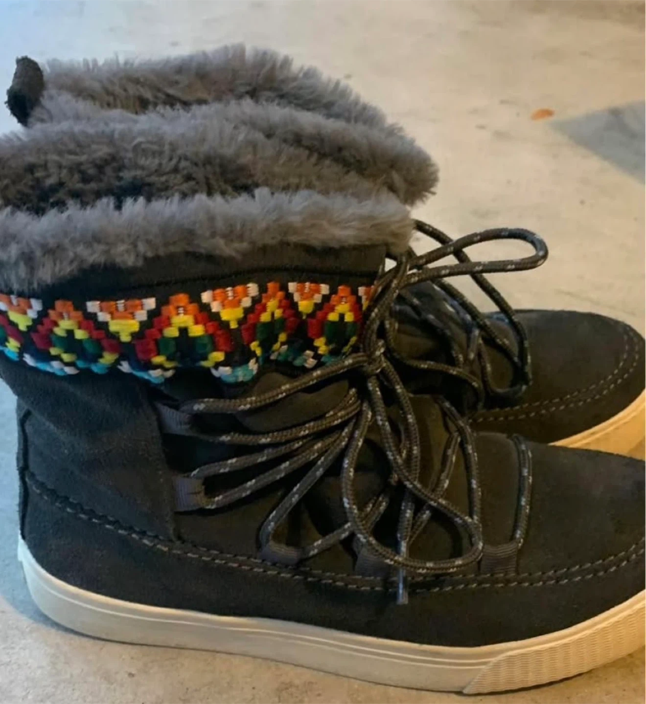 Selling a pair of TOMS women's winter boots in a stylish grey suede! They feature a cozy faux fur trim and a colourful patterned accent around the ankle.