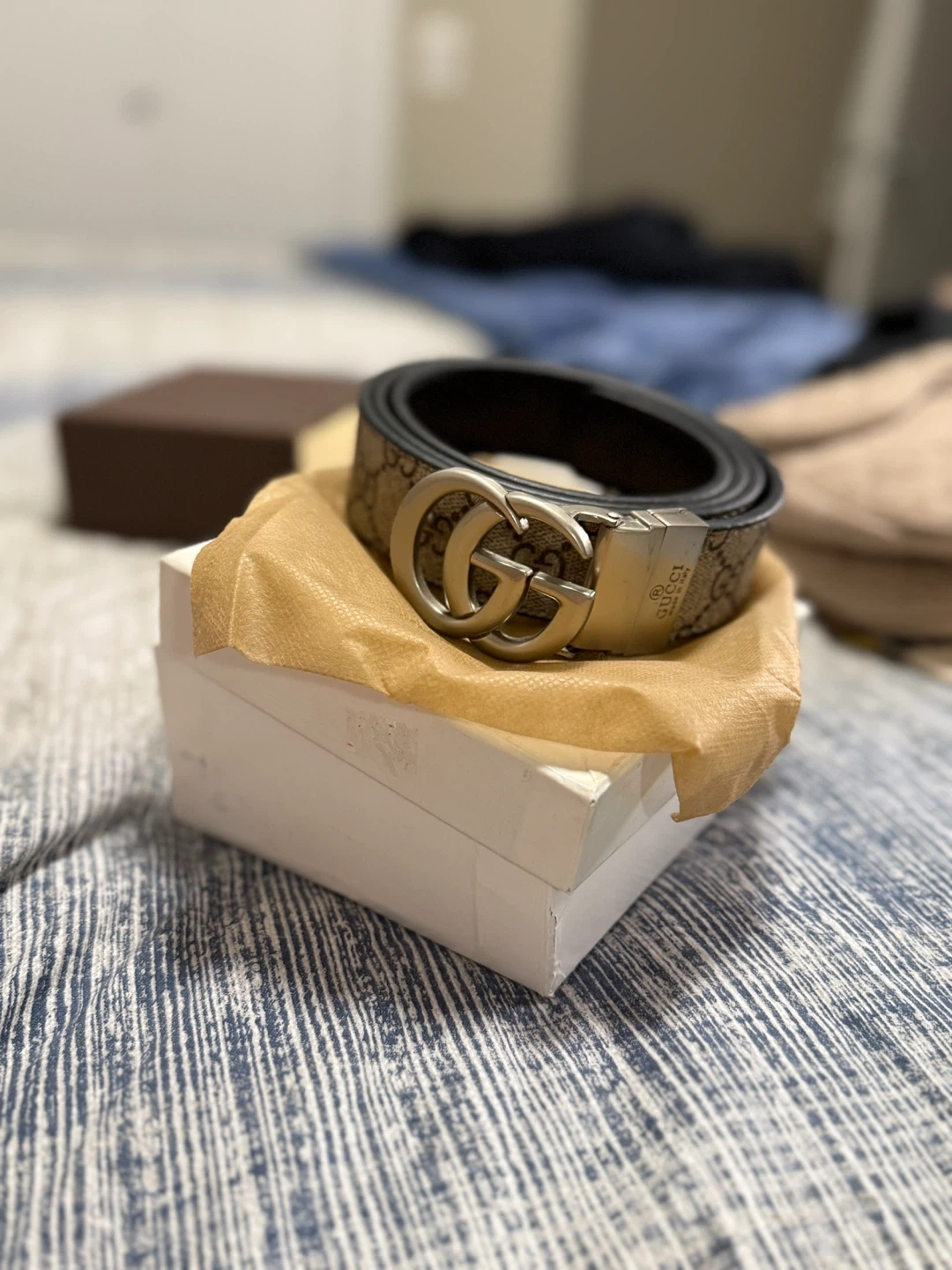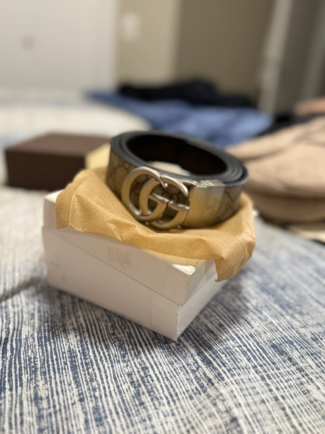 Selling a Gucci belt that comes with the original box! It features the iconic GG logo. It's in great condition and ready for a new home