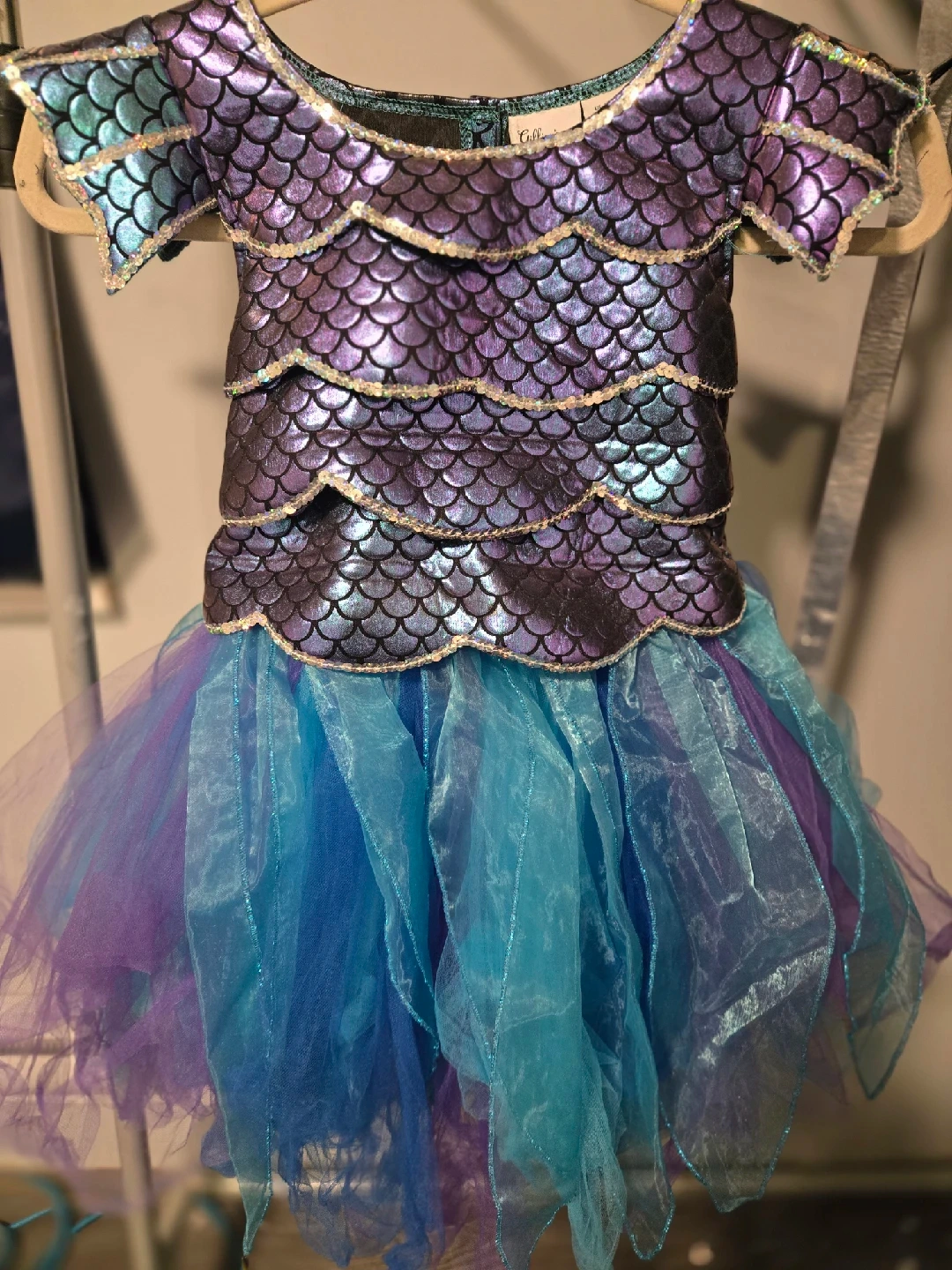 A cute mermaid costume dress! It features a scale-like design on the bodice and tail, with a blue and purple tulle skirt. Perfect for dress-up or Halloween!