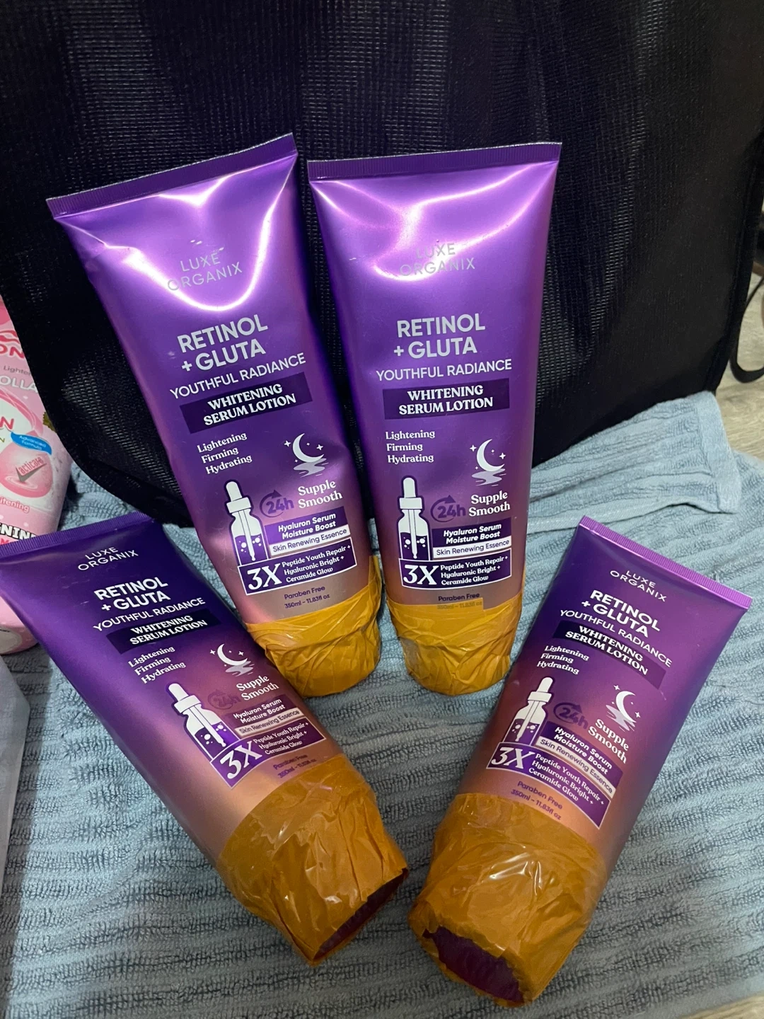 Selling Luxe Organix Retinol + Gluta Youthful Radiance Whitening Serum Lotion. It's a lightening, firming, and hydrating lotion that keeps your skin supple and smooth for 24 hours. Contains Hyaluron Serum Moisture Boost and Skin Renewing Essence. Paraben free and comes in a 350ml size