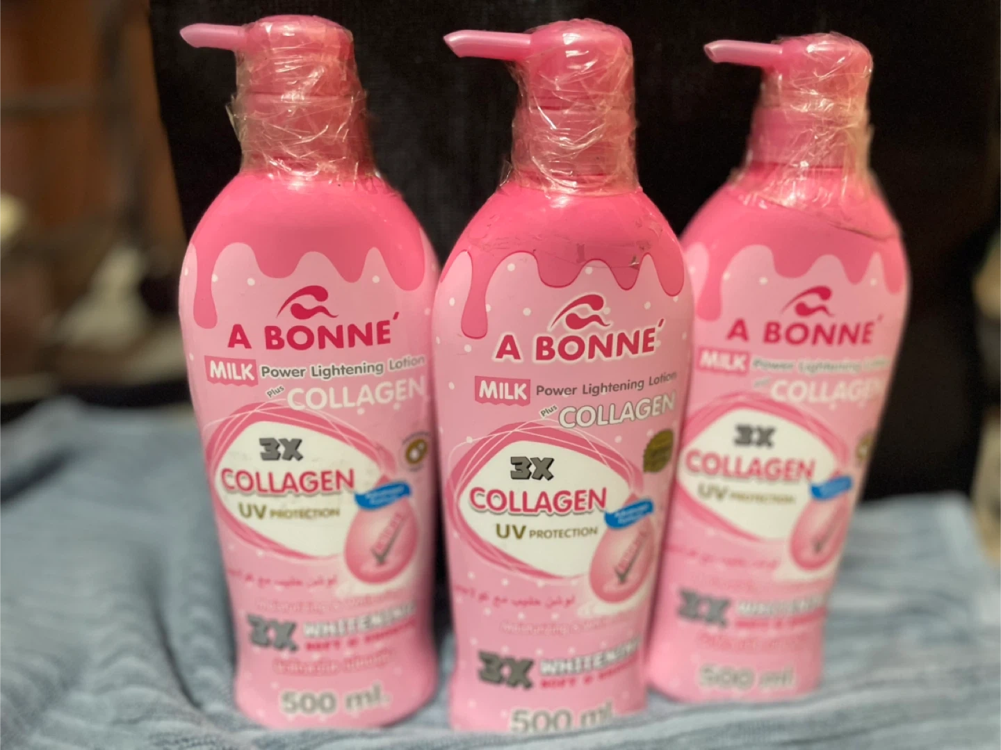 I'm selling A Bonne Milk Power Lightening Lotion with Collagen. This lotion comes in a 500ml bottle and is designed to moisturize and whiten the skin, leaving it soft and smooth. It also includes UV protection