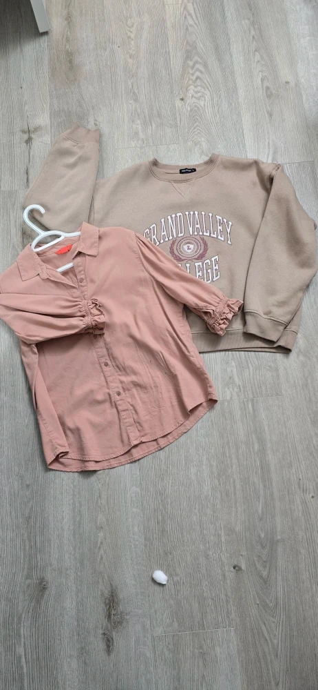 Selling a sweater and a blouse! The sweater is a light beige colour with "GRAND VALLEY COLLEGE" written on it. The blouse is a light pink colour with ruffles on the sleeves. Both items are in good condition!
