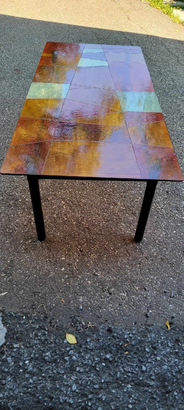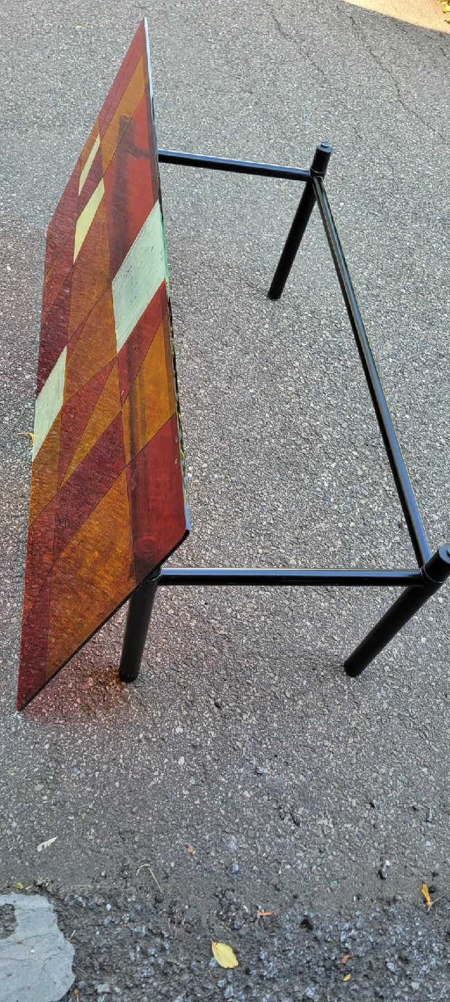 Check out this unique coffee table! It features a colourful geometric design on the tabletop and sleek black legs. It's sure to add a pop of colour and style to any living space