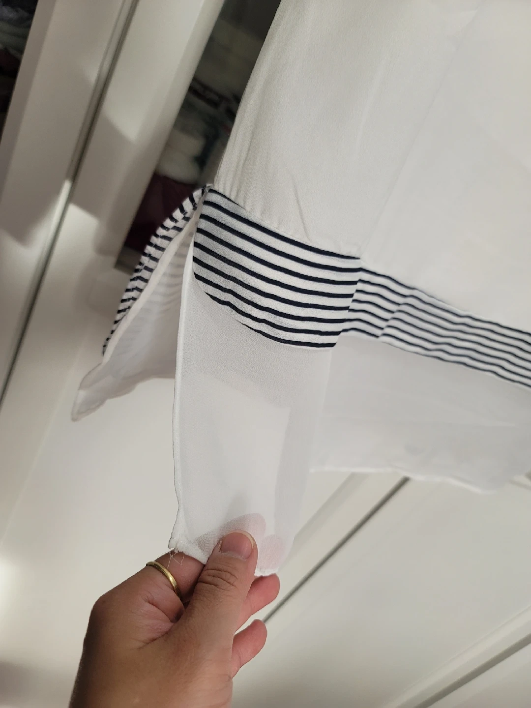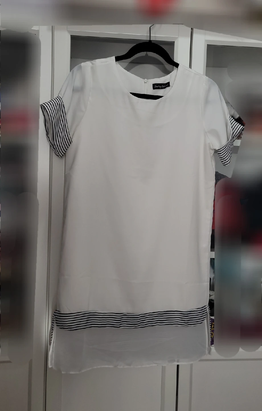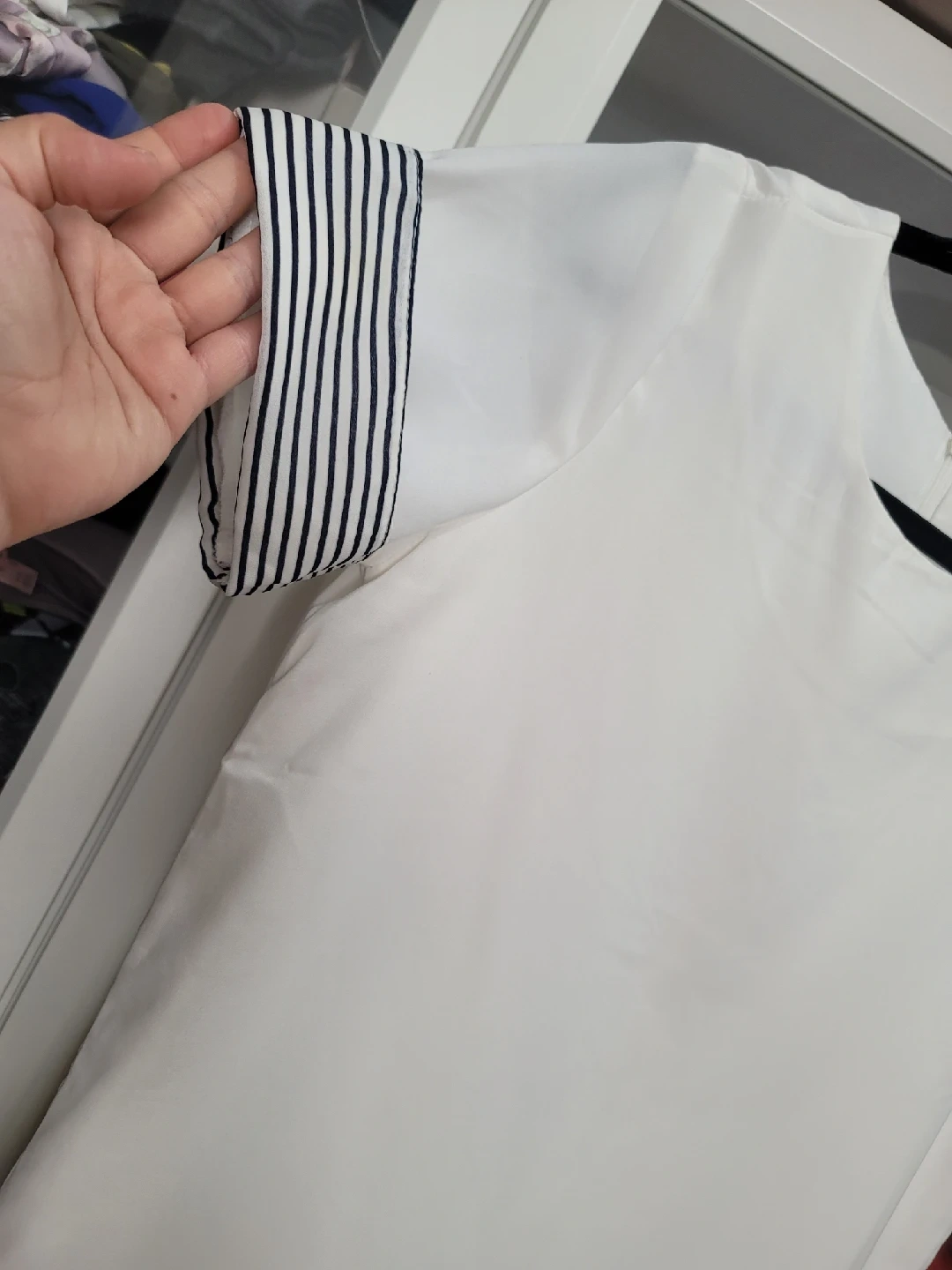 10A lovely cream-coloured tunic top from Sanctuary! Features a round neck and black and white striped detailing on the sleeves and hem. Perfect for a casual or dressed-up look