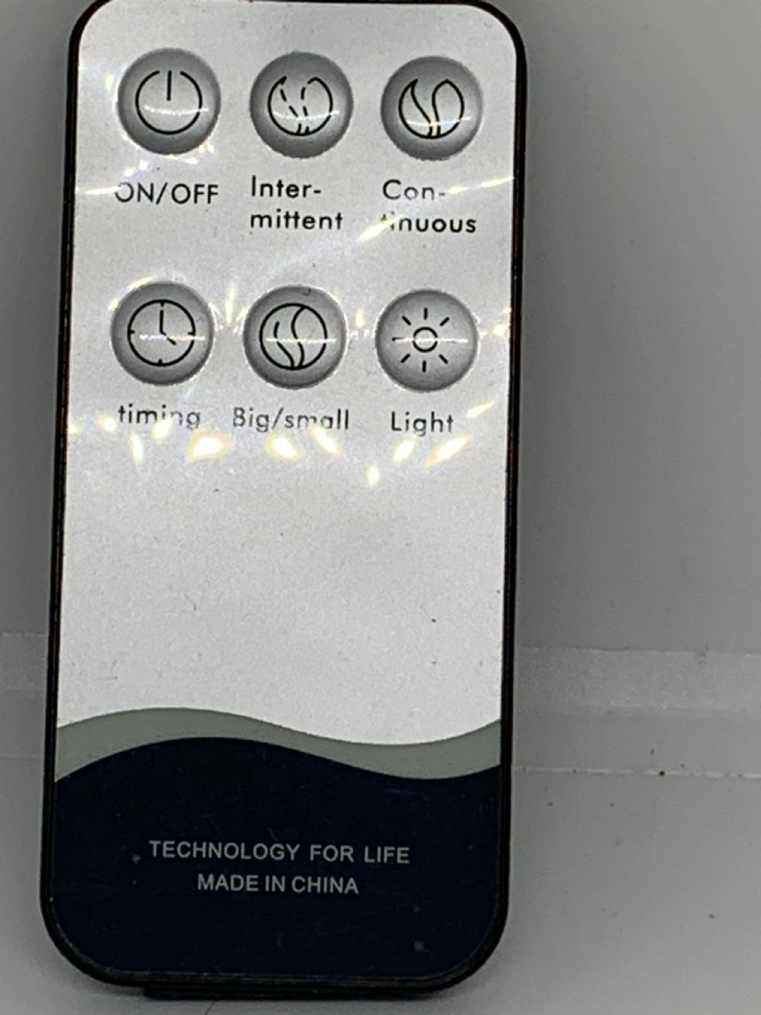 91Selling a used remote control. It has buttons for on/off, intermittent, continuous, timing, big/small, and light settings. "Technology for life" is printed on the bottom.