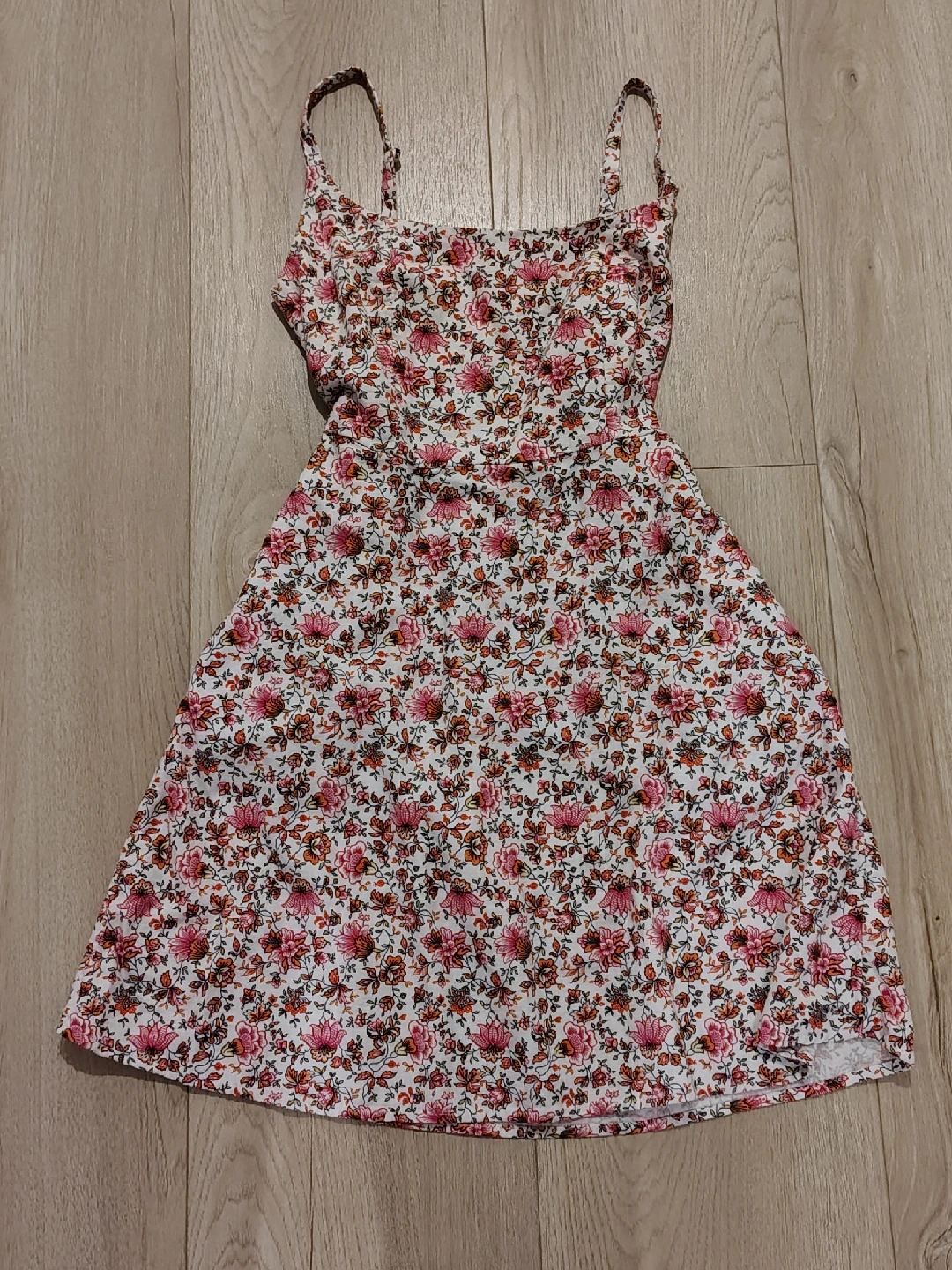 Cute floral sundress! Perfect for summer days. It's in great condition and has a lovely pattern with pink and orange flowers on a white background. pair with cowgirl boots! size small to medium