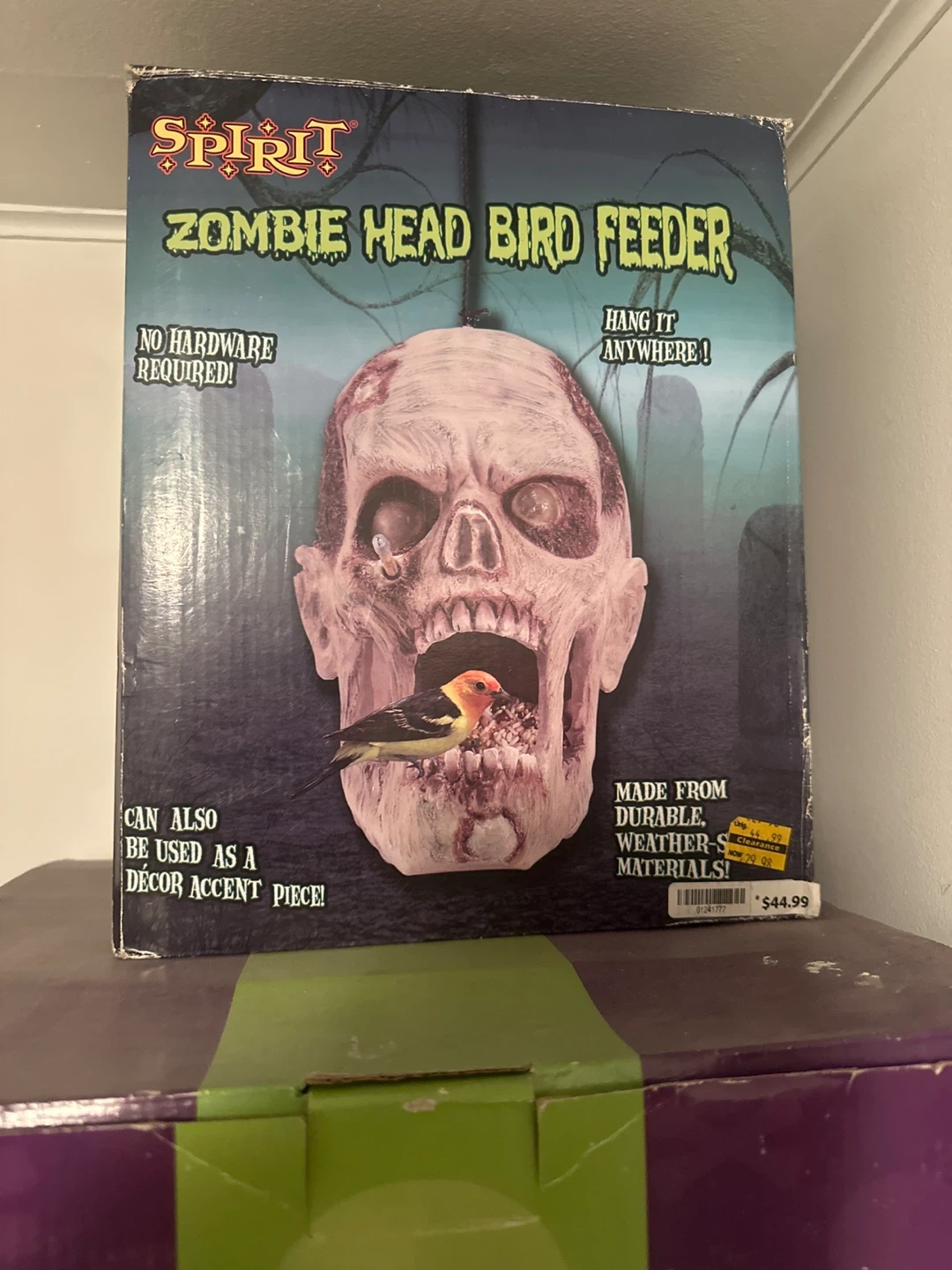 Selling a Spirit Zombie Head Bird Feeder! It's made from durable, weather-resistant materials and requires no hardware for hanging. It can also be used as a decor accent piece. Originally priced at $44.99. New, never used.