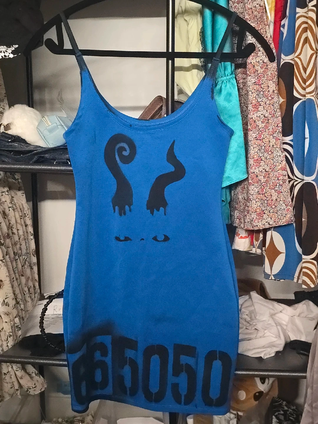 Cute blue mini dress with a unique graphic print! It features a skeleton design on the front and other interesting details. One of a kind and hand-printed. Perfect for adding a bit of edge to your wardrobe. Great for casual wear or a night out!