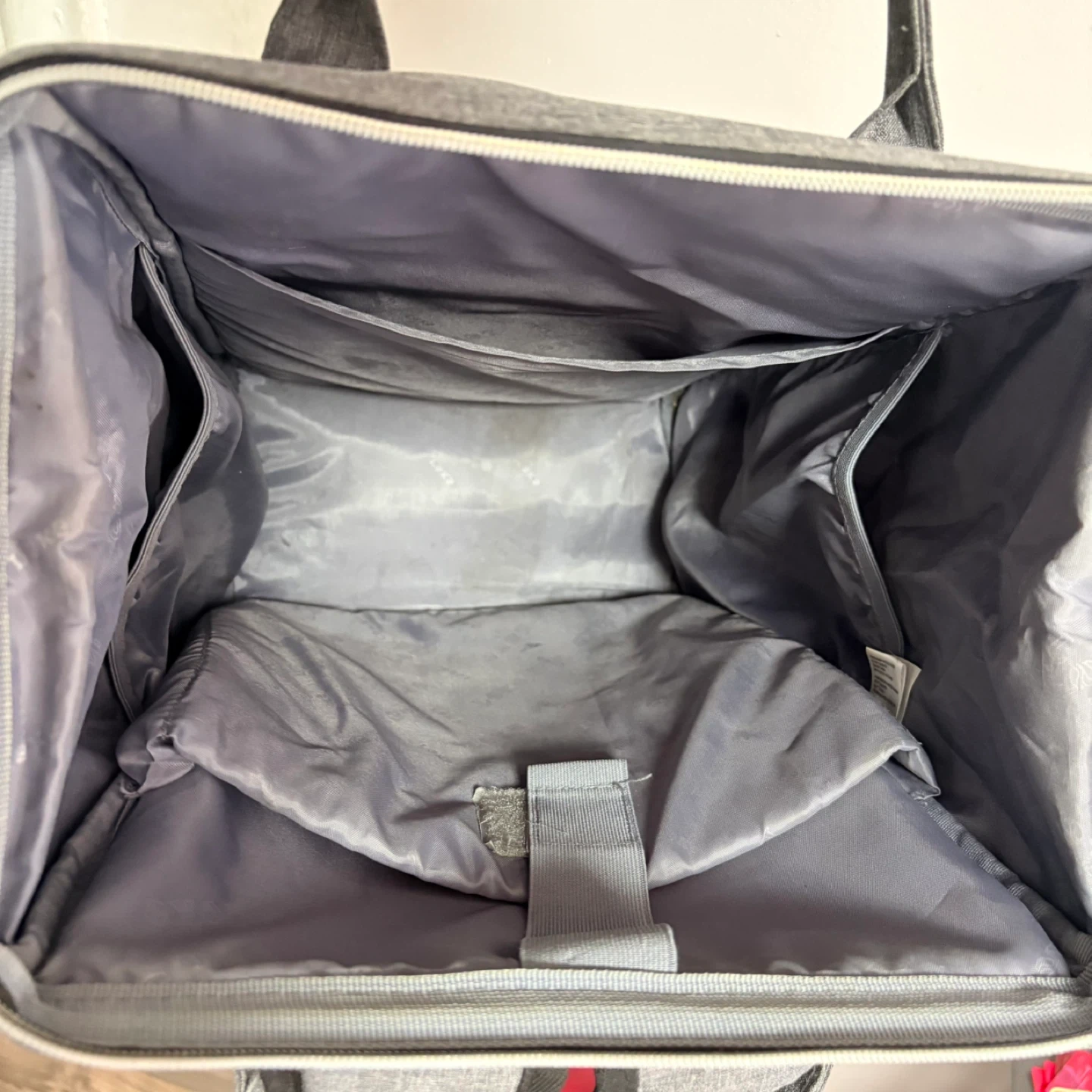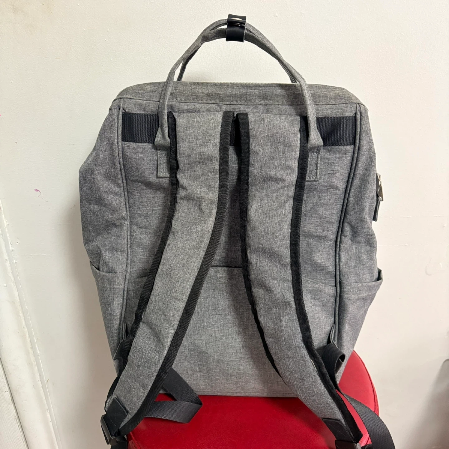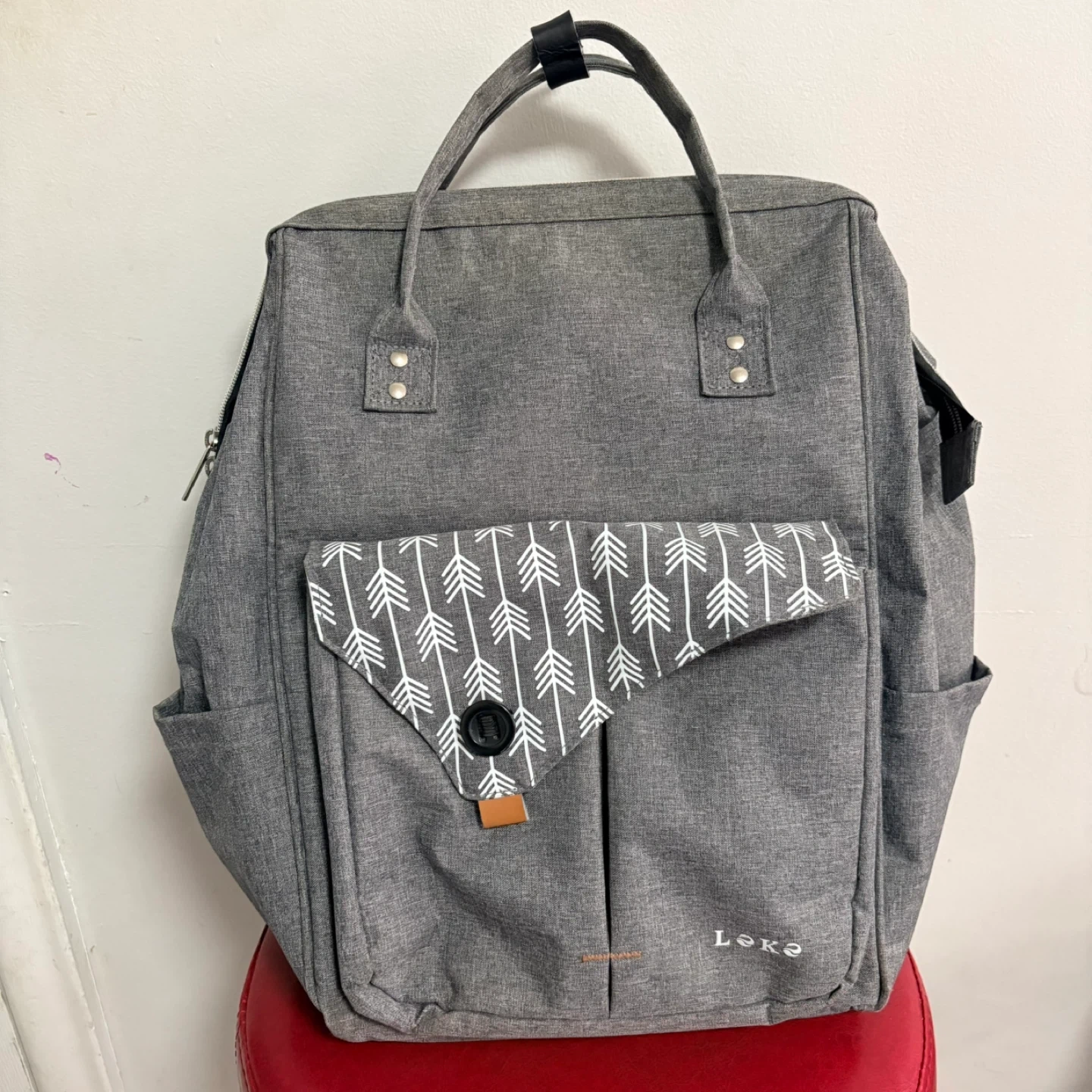 This is a Leke bag backpack in grey. It has a front pocket with a unique arrow pattern and a button closure. There are multiple compartments inside, perfect for organizing all essentials.