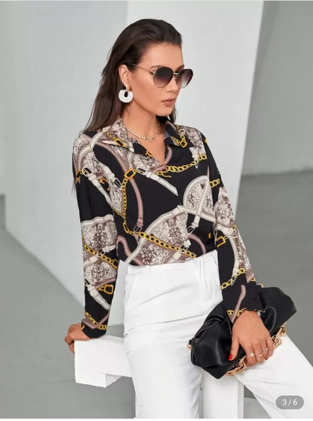 Snakeskin blouse with a unique chain and belt print! Perfect for adding a touch of edgy style to your wardrobe.