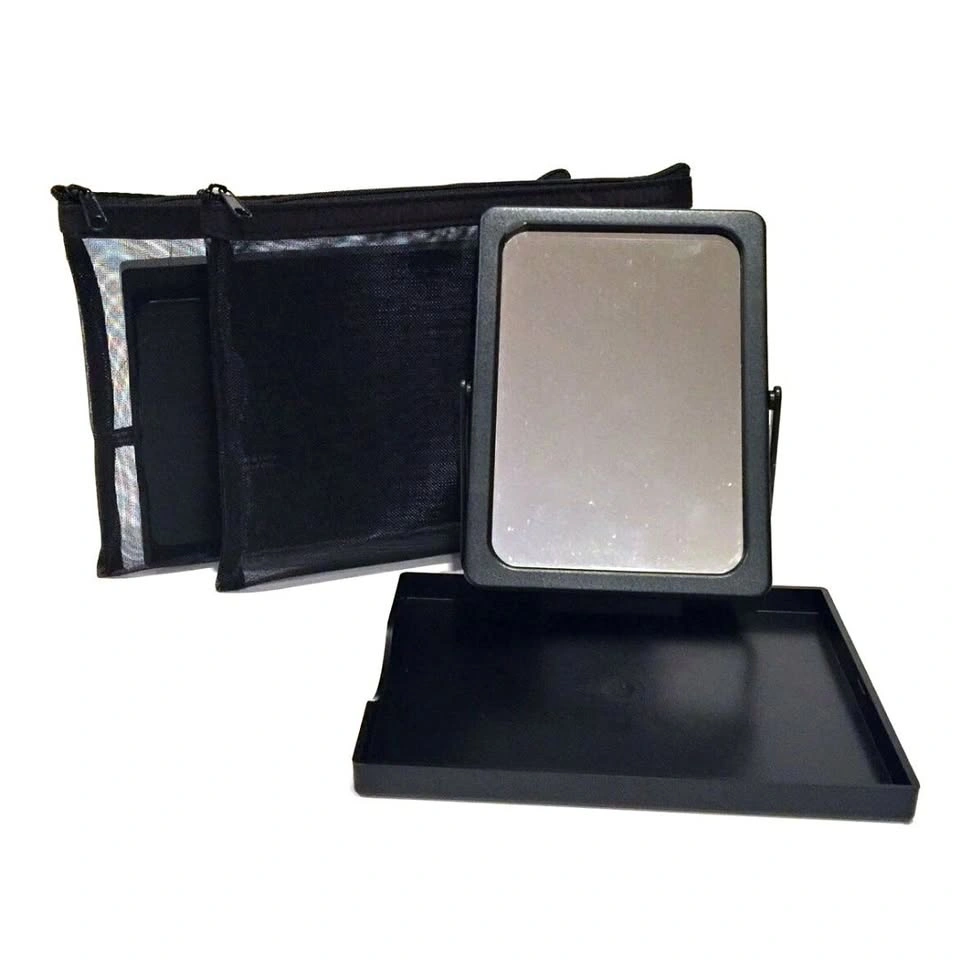 The mirror and tray are made of a sleek, lightweight black plastic and easily convert into a standing mirror. This mirror does not have magnification.
