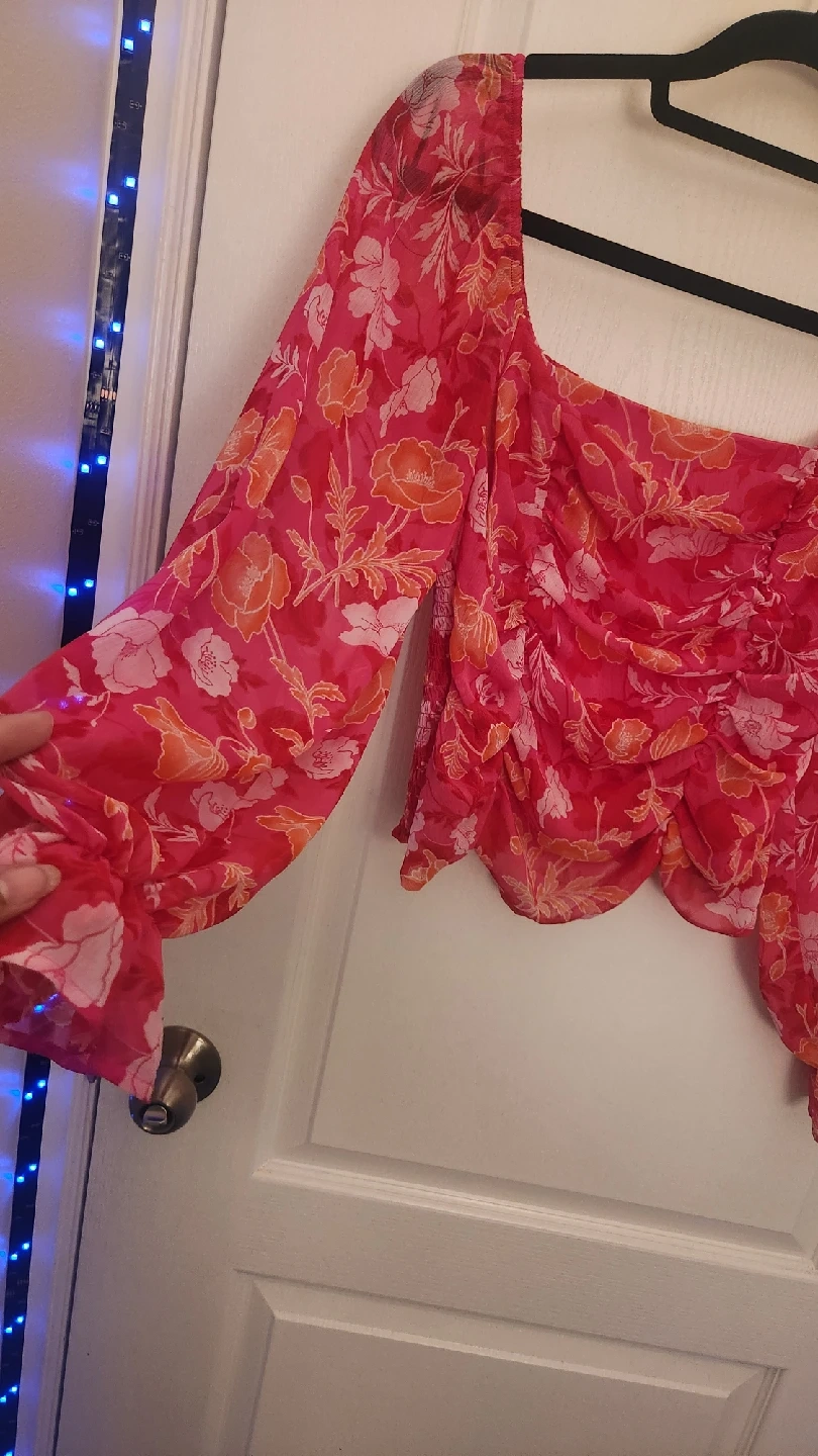 20Here's a cute Pleione floral print long sleeve top! It's a size small and features a vibrant pink and orange floral pattern. Perfect for adding a pop of colour to your wardrobe! Stretchable material fits small and medium