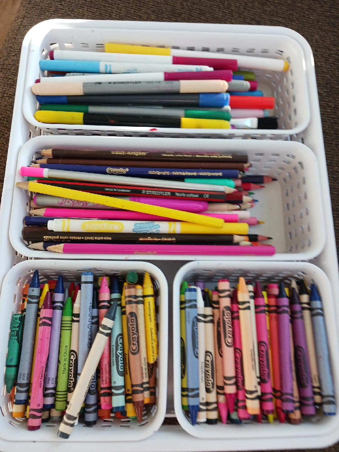 A collection of art supplies including Crayola crayons, Staedtler markers, and assorted colour pencils. Perfect for kids or anyone who enjoys drawing and colouring!