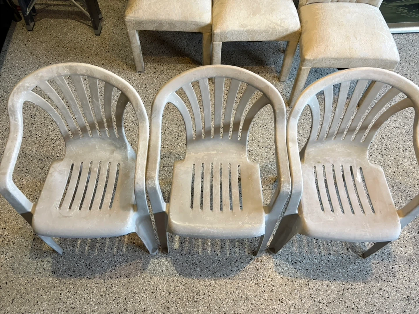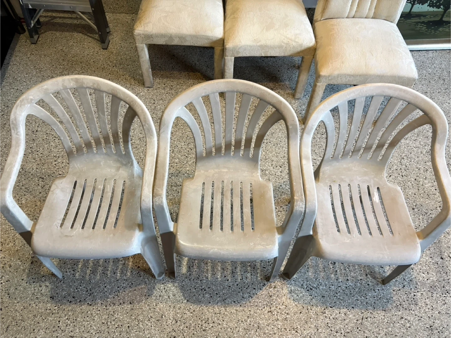 Selling a set of 3 outdoor plastic chairs. They're perfect for the patio or garden and are easy to clean. A few signs of wear, but still very sturdy and functional.