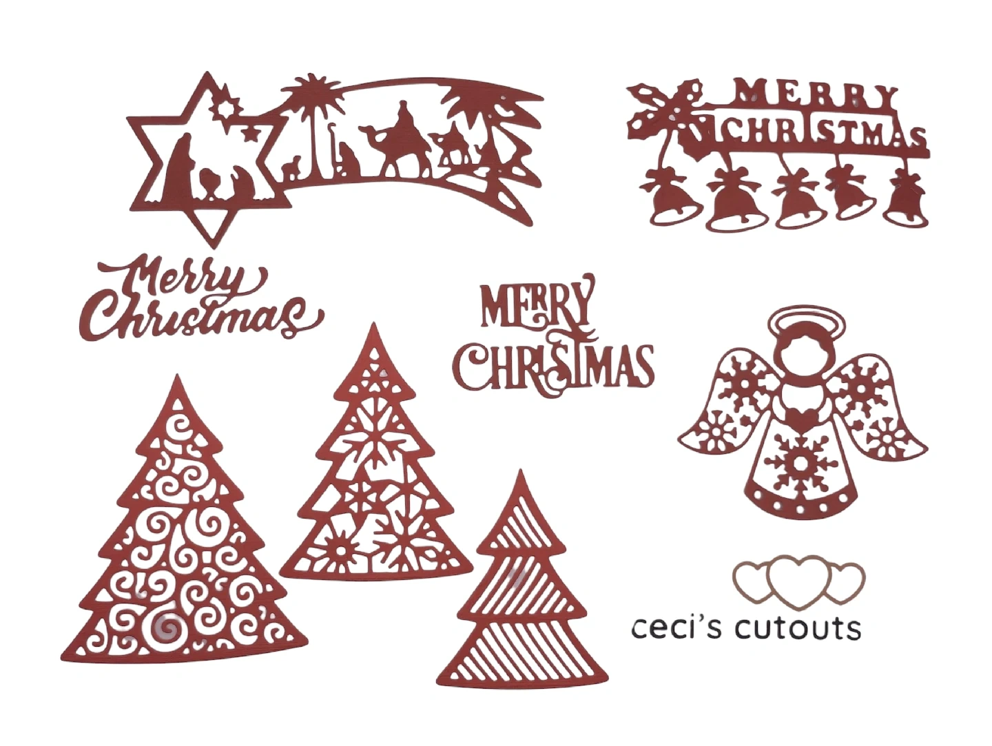 Sale over 50% off on: Assorted Christmas-themed paper die cuts from Ceci's Cutouts! Perfect for scrapbooking, card making, or any festive crafting project. Includes various designs like angels, Christmas trees, nativity scenes, and more, in both red and black.