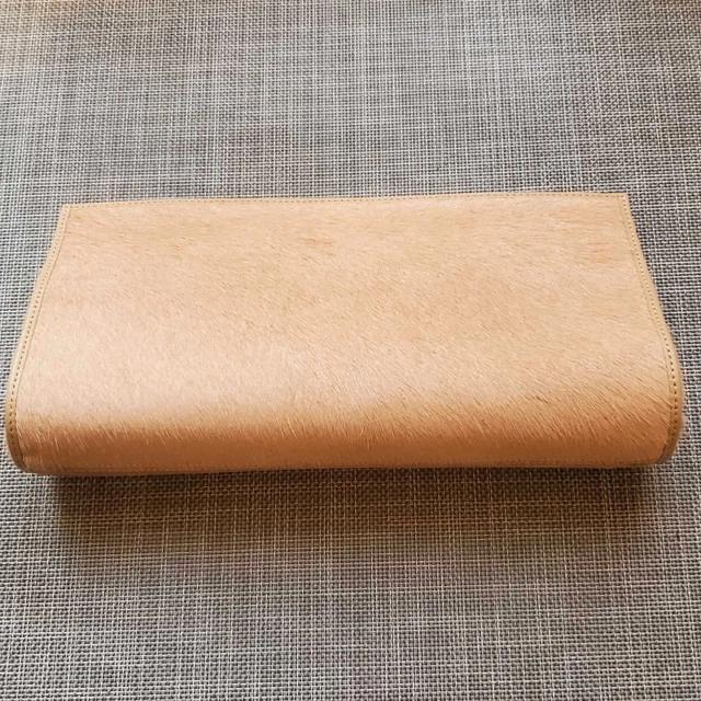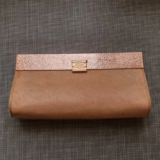 Elevate your ensemble with this chic, Ted Baker clutch, crafted with a distinctive pony hair finish and rose gold hardware, perfect for a night out, adding a touch of character to its sophisticated design. It's in like new condition. Key features include: * Pony hair texture * Rose gold-tone hardware * Secure closure clasp * Internal slip pocket