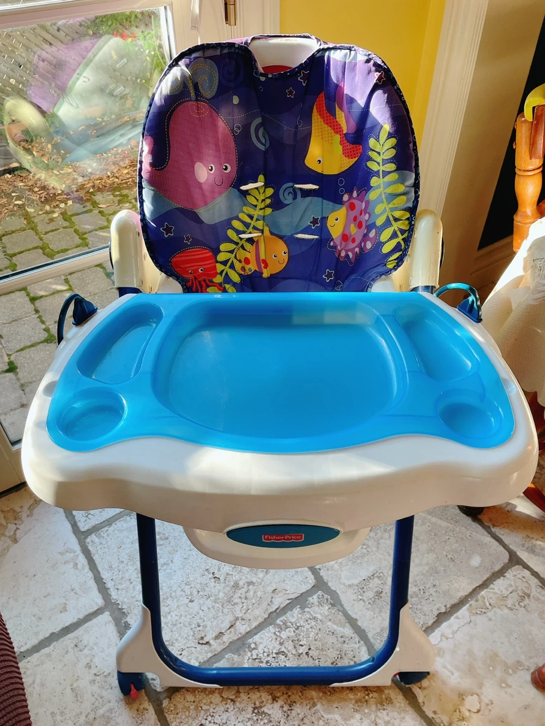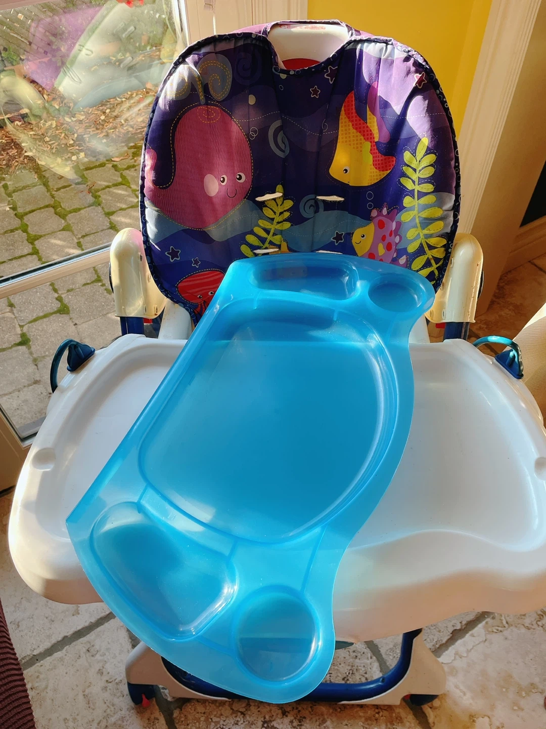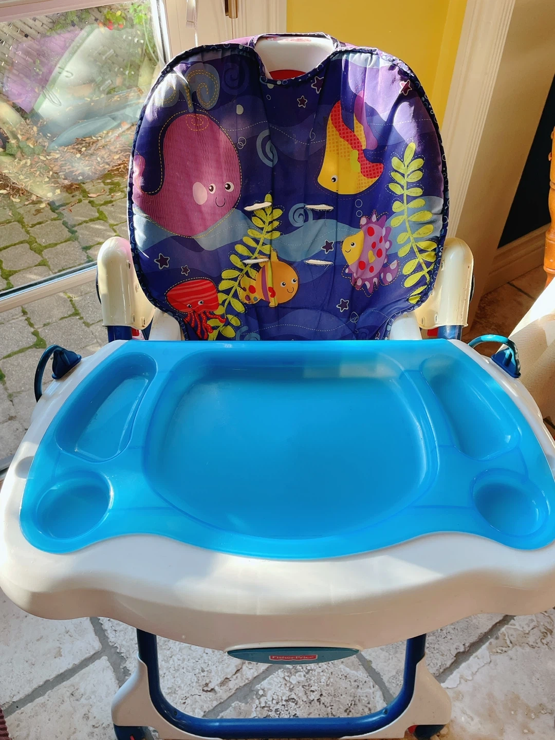 76Modern baby high chair with a sturdy plastic and metal frame. The seat belt is not included because we never used it. Washable seat cover and removable feeding tray with cup holders (two round slots) for easy cleaning. Adjustable height and smooth rolling wheels for easy movement around the room. Perfect for babies and toddlers transitioning to self-feeding.