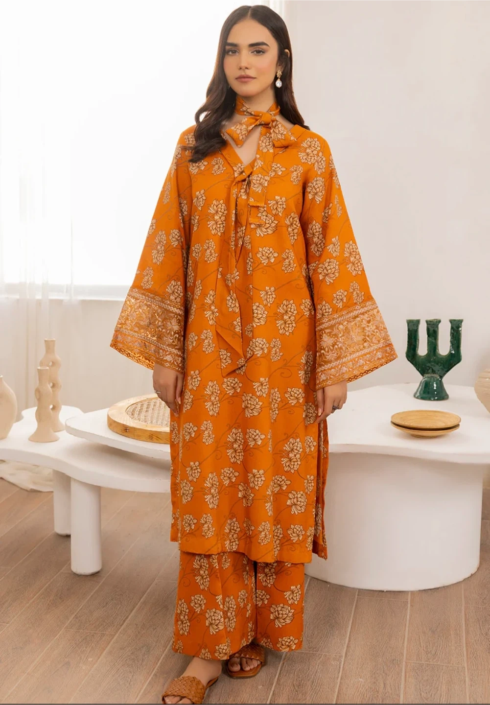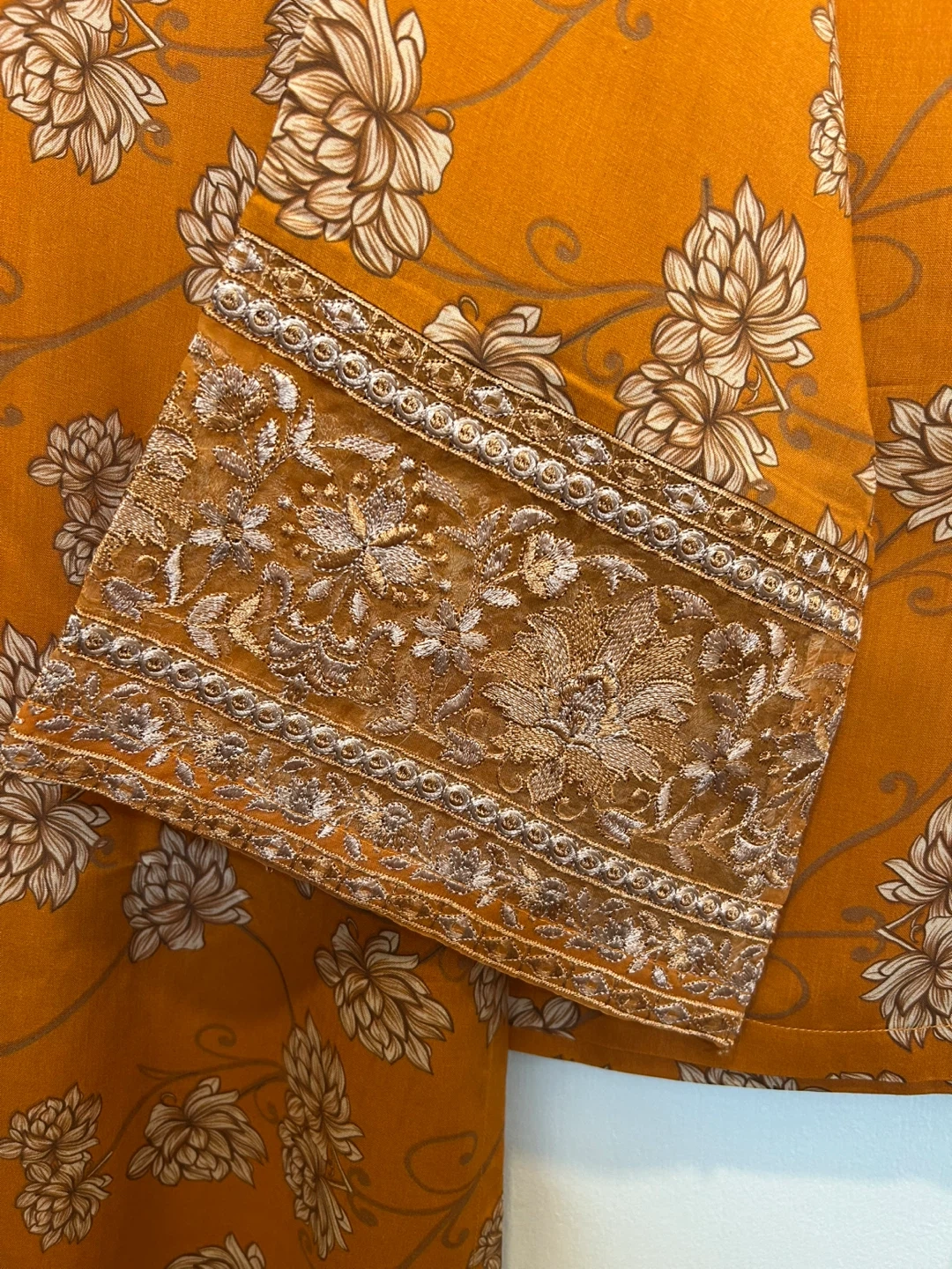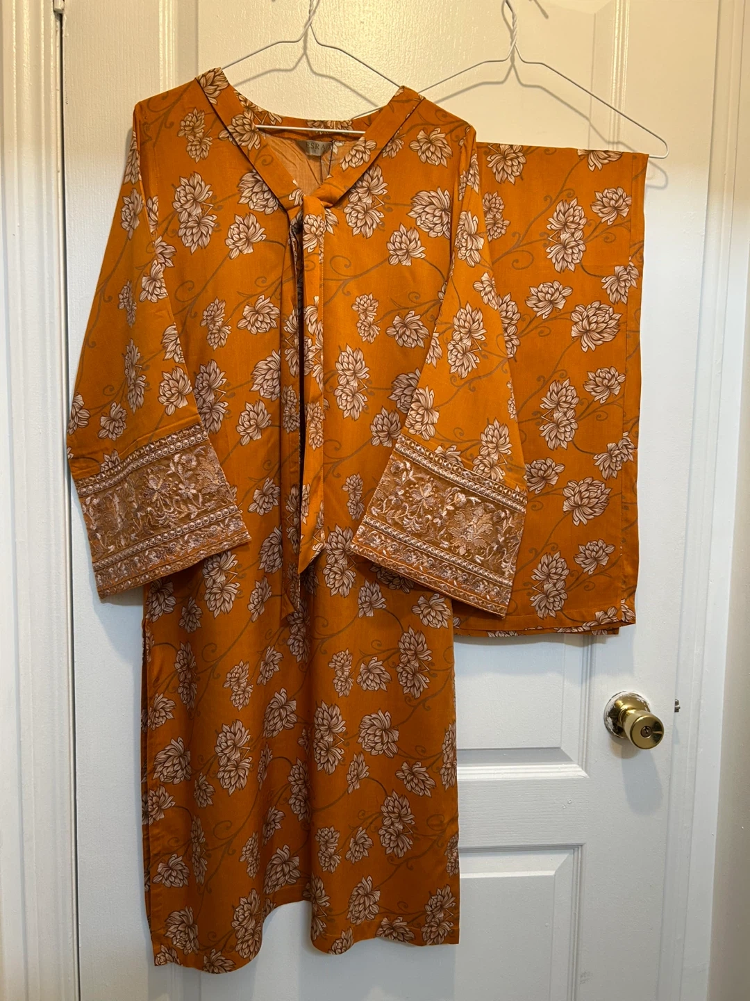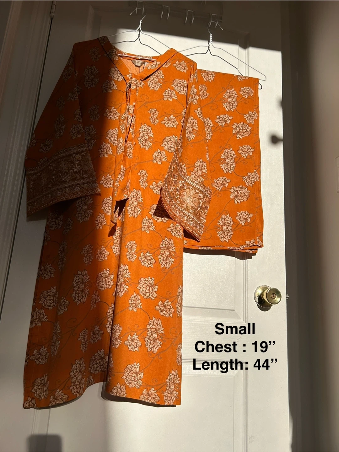 111Selling a beautiful orange floral linen shirt and trouser. It's a size small with a chest measurement of 19 inches and a length of 44 inches. The fabric has a lovely floral pattern and the sleeves have intricate embroidery detailing. Perfect for a special occasion or everyday wear!