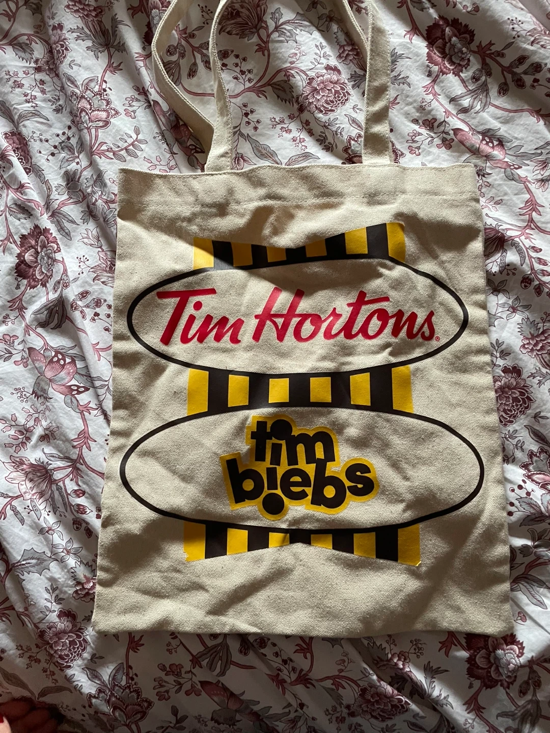 Tim Hortons Tim Biebs tote bag. It's in great condition. No stains, sturdy material.