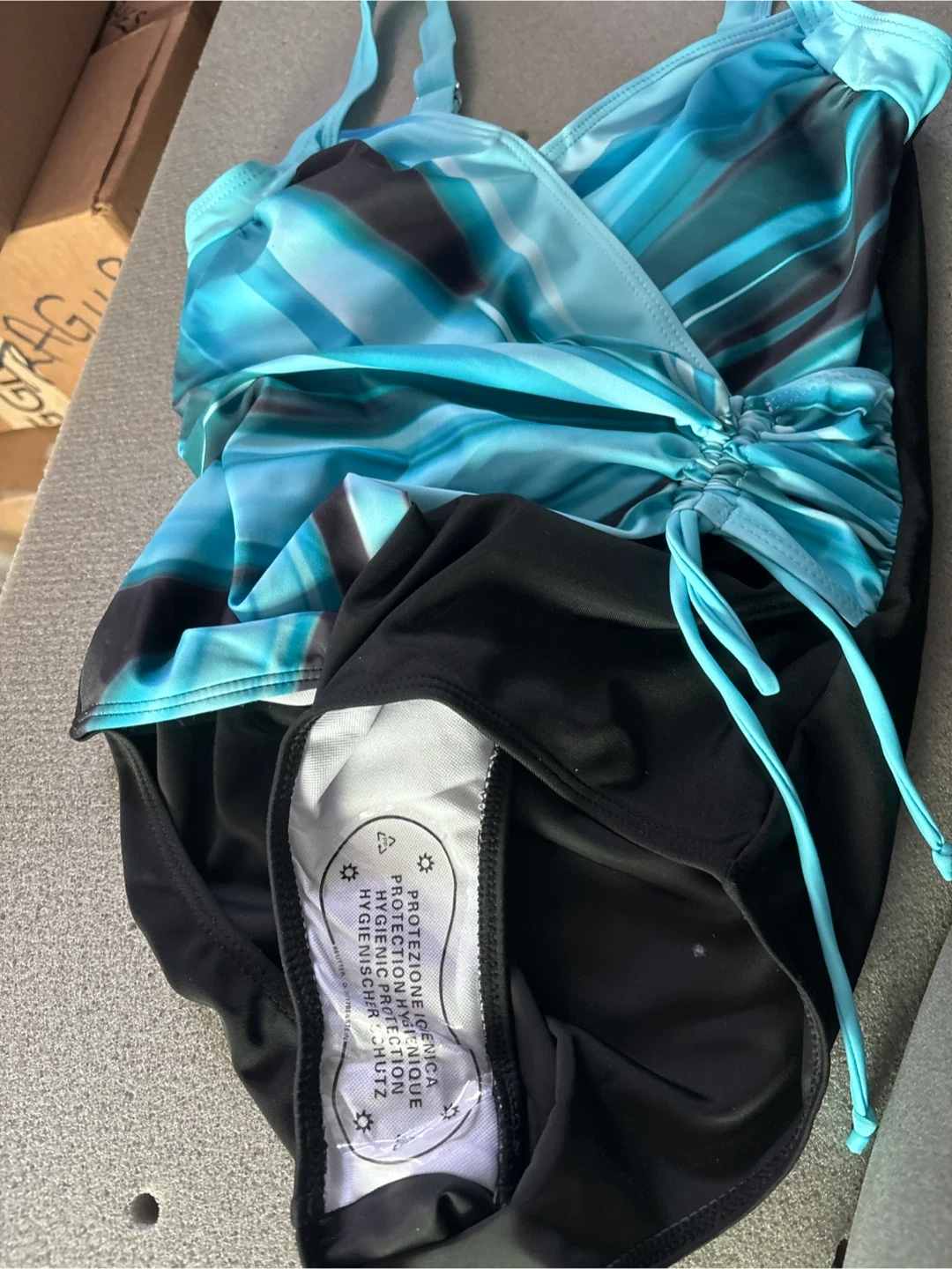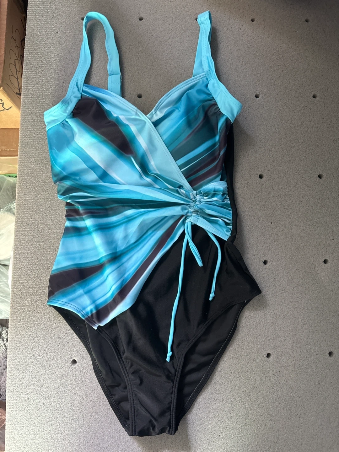 Selling a cute one-piece swimsuit in size small! It's a stylish blue and black design, perfect for the pool or beach. The material is 82% Polyester and 18% Elastane for a comfortable fit. Would fit someone approximately 5'5"-5'7" with bust 33.9-35.5, waist 26-27.6, and hips 35.9-37.4