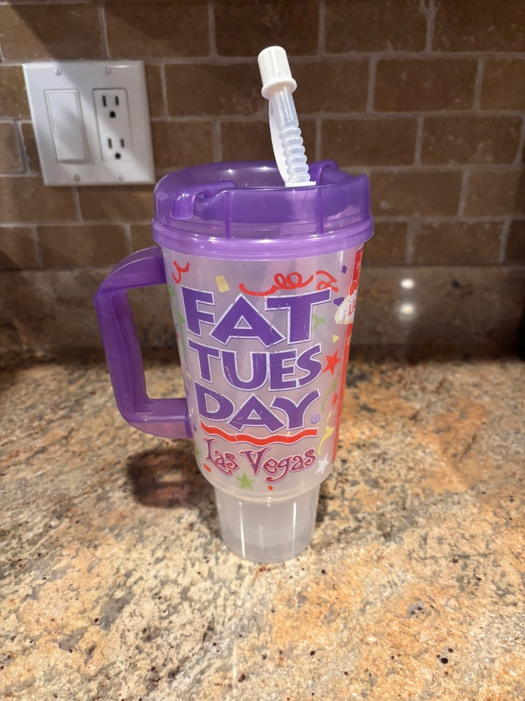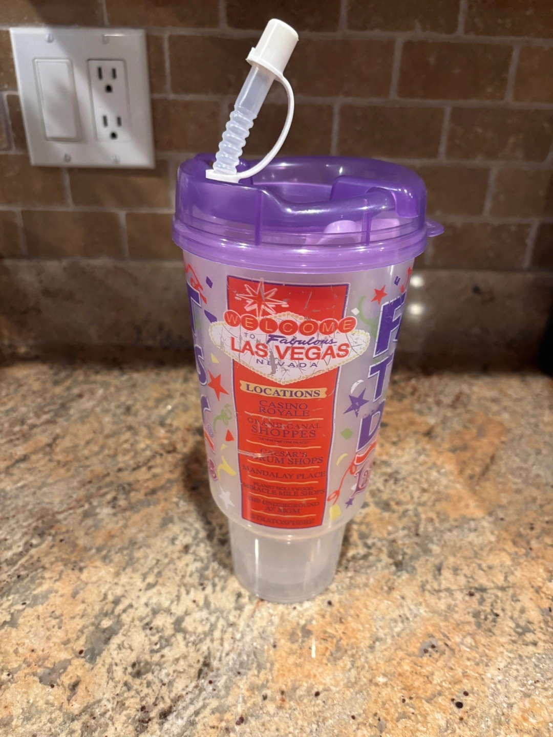 Souvenir cup from Fat Tuesday in Las Vegas! It's got a fun design with the Las Vegas welcome sign and a list of locations. Comes with a lid and straw