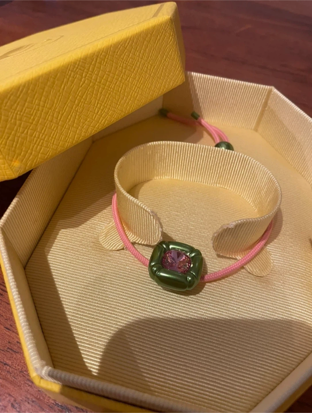Selling a beautiful Swarovski Lucent bracelet! It features a vibrant pink crystal set in a unique green setting, strung on a delicate pink cord. It comes with its original box, making it perfect for gifting or treating yourself. It's a real eye-catcher!