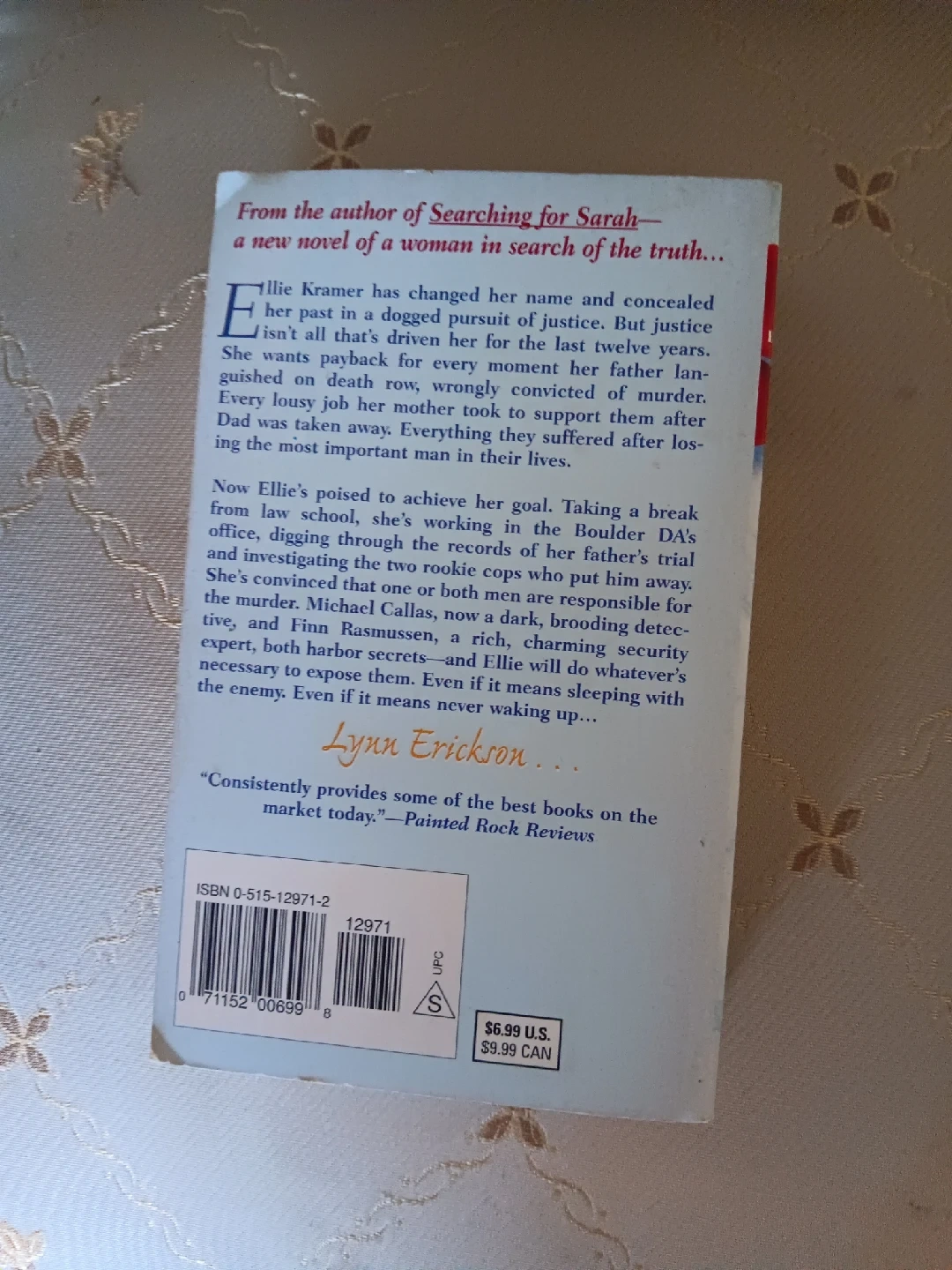 Selling the book 'On Thin Ice' by Lynn Erickson. It's a novel about searching for the truth and justice. The cover has a nice design with red petals and a snowy branch. A great read for suspense and romance!