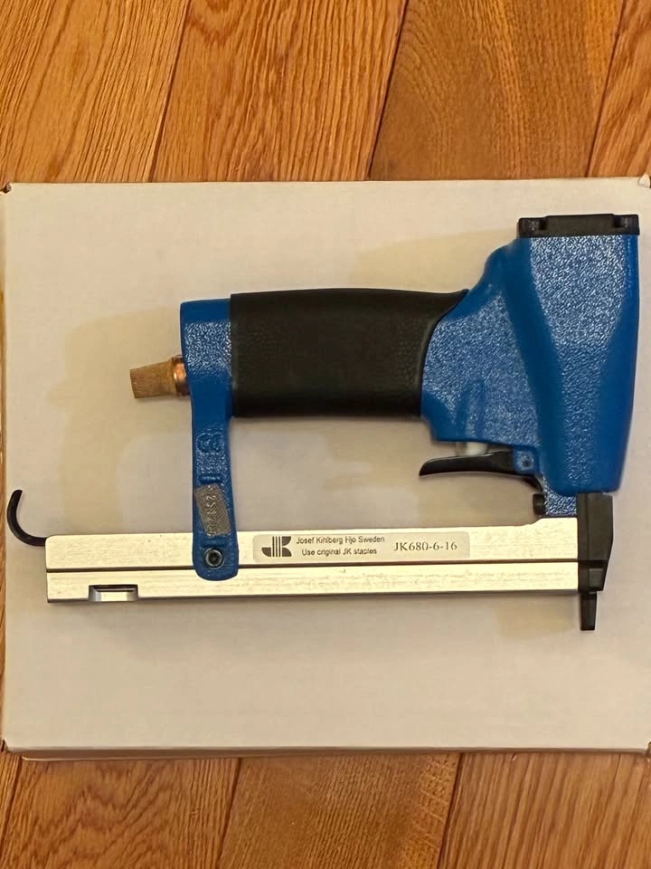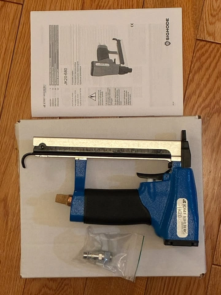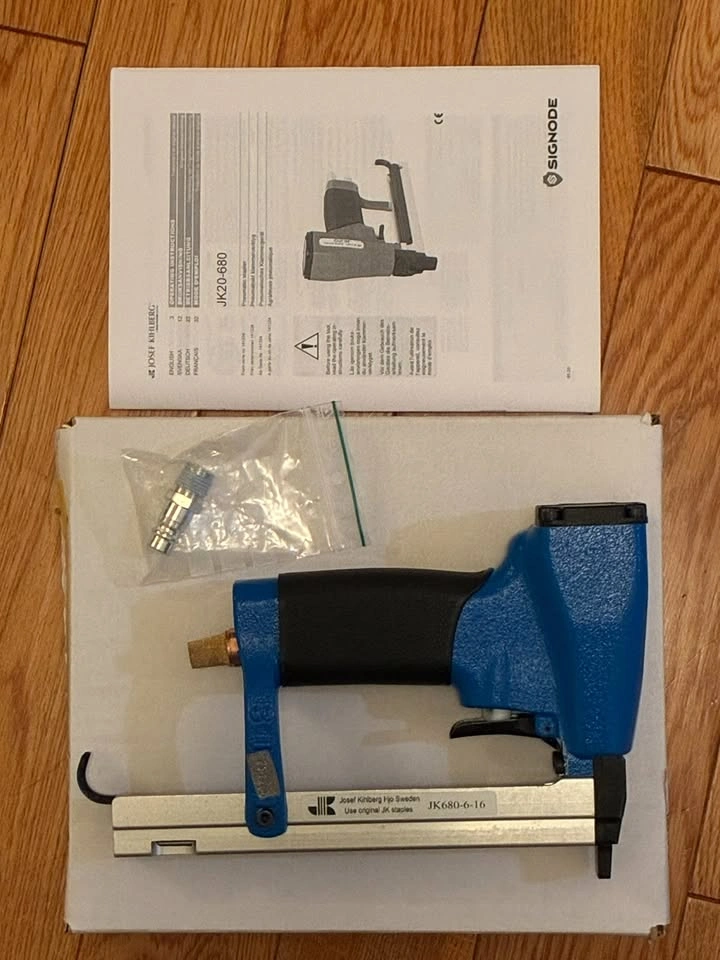 11Josef Kihlberg Pneumatic Stapler, JK20-680, Brand new Made in Sweden This stapler is especially suitable for upholstery work or other applications where fabric is attached to wood, but naturally also for other materials such as boards and slabs materials to wood. Negligible recoil Light weight Good balance. Low noise with effective muffler. Weight: 1 kg ( 2.2 lbs ) Dimensions: 230 × 43 × 150 mm ( 9.1 x 1.7 x 5.9 in ) Magazine capacity: 143 fasteners Staple leg length: 6 - 14 mm ( 1/4 - 9/16 in ) Max. pressure: 7 bar ( 102 psi ) Leg length: 230 mm ( in ) Lubrication: Yes Nose length: 14 mm ( 0.6 in ) Original price: $526CAD Now only: $390CAD