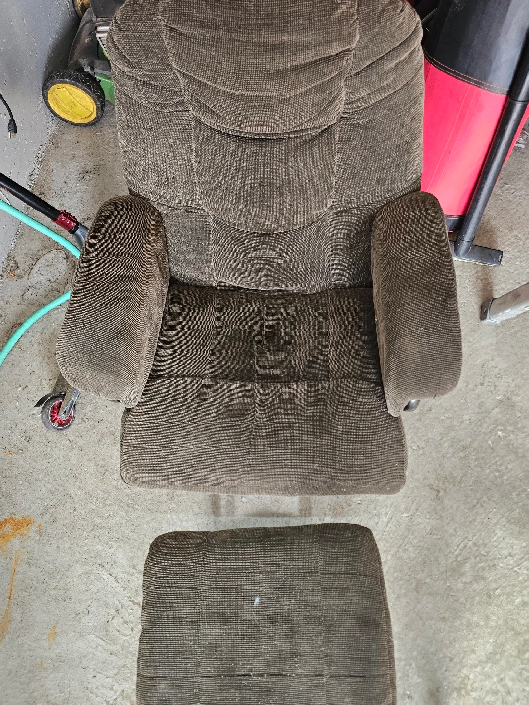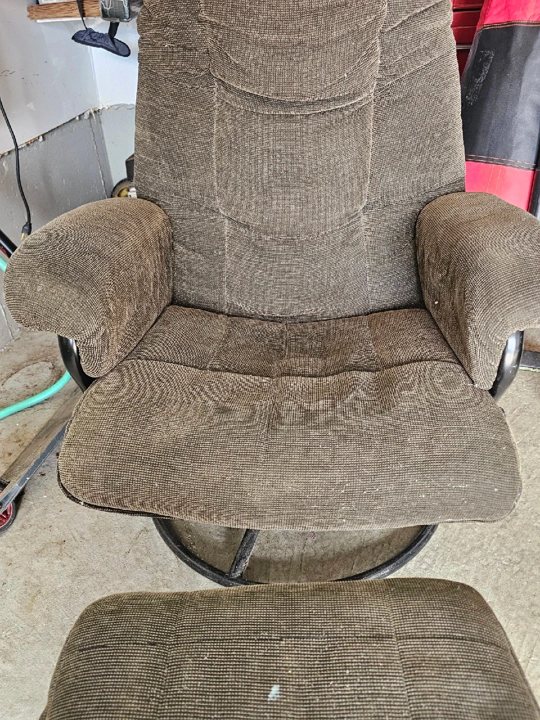 Selling a comfy brown recliner glider rocker chair with a matching ottoman. It's in used condition, perfect for relaxing after a long day or for a nursery.
