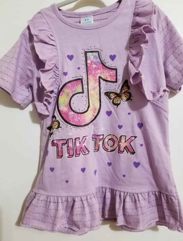 Cute TikTok-themed pajama set for kids! The set includes a lilac top with ruffle sleeves and a matching pair of black leggings with TikTok logos. Perfect for your little TikTok fan!